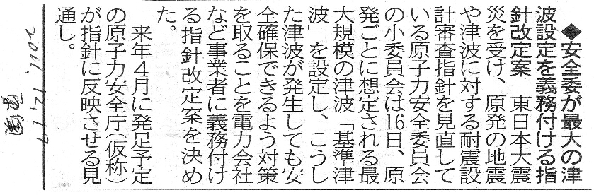 | [2011_12_17_02]安全委が最大の津波設定を義務付ける指針改定案(東奥日報2011年12月17日) |
