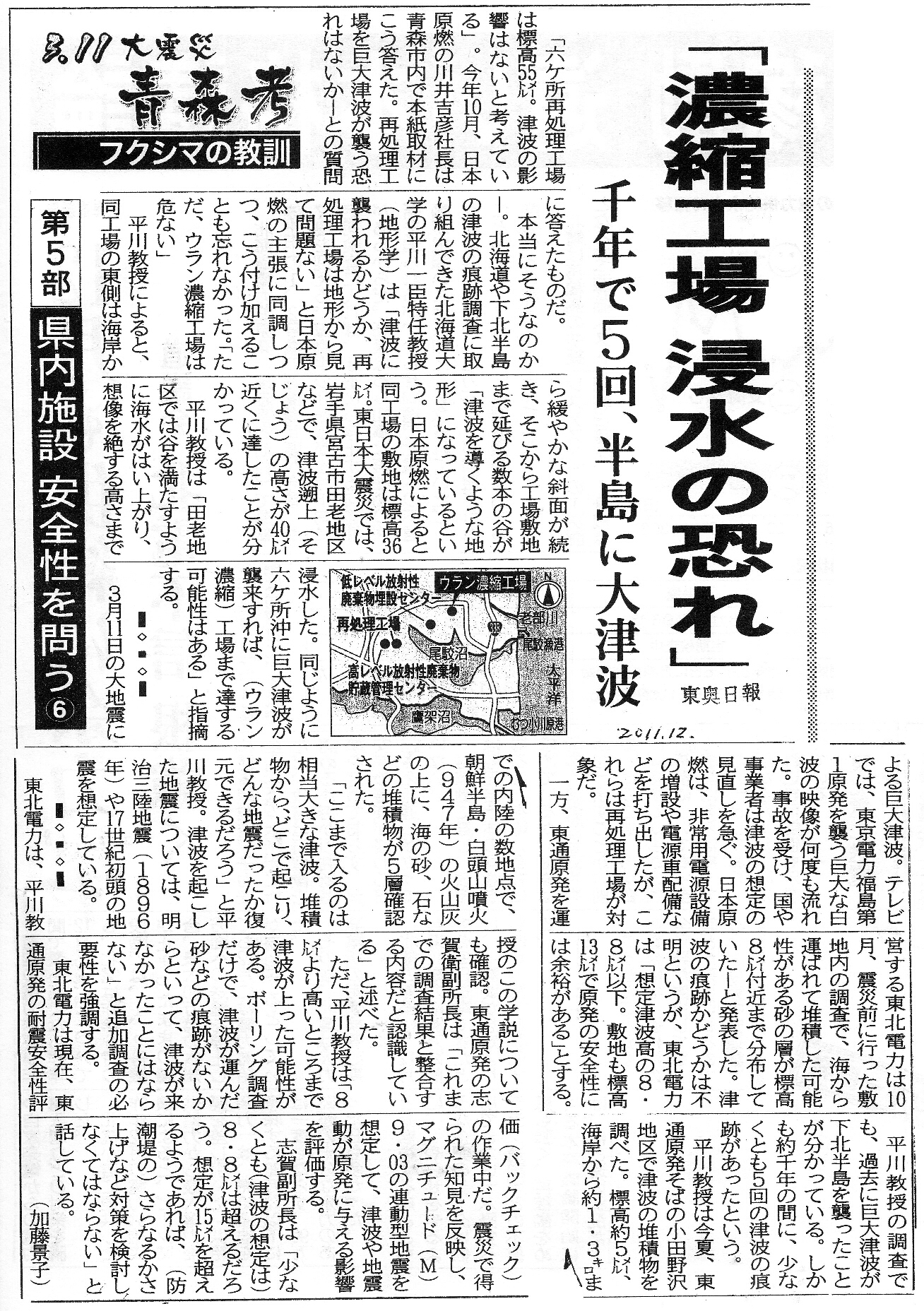 | [2011_12_22_01]3.11大震災 フクシマの教訓 「濃縮工場 浸水の恐れ」 千年で5回、半島に大津波 第5部 県内施設 安全性を問う6(東奥日報2011年12月22日) |