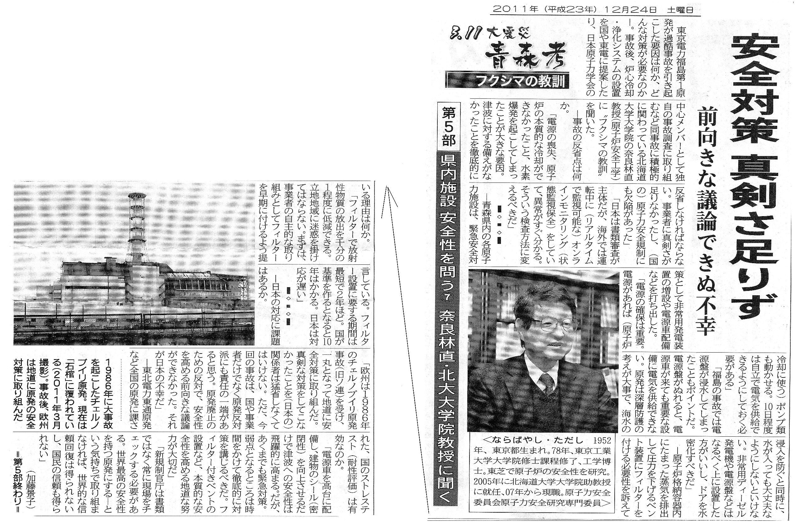 [2011_12_24_01]3.11大震災 青森考 フクシマの教訓 第5部 県内施設安全性を問う7 奈良林直ただし・北大大学院教授に聞く 安全対策 真剣さ足りず 前向きな議論できぬ不幸 (東奥日報2011年12月24日)