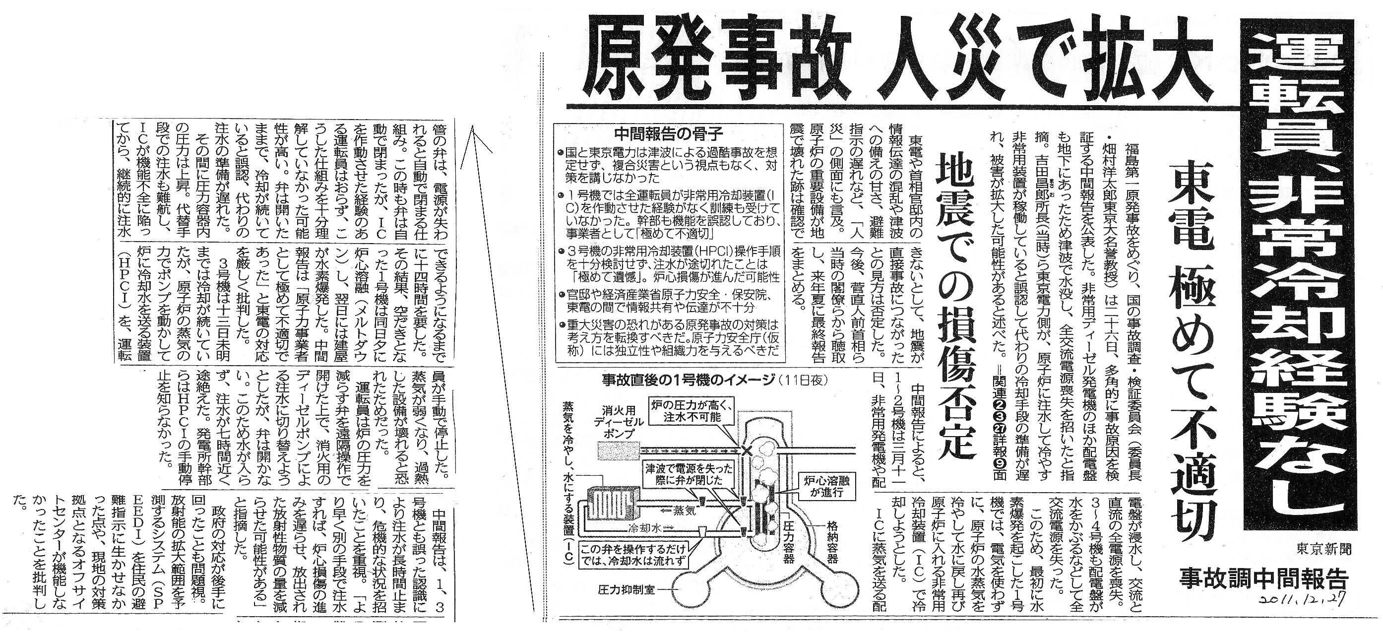 [2011_12_27_01]原発事故 人災で拡大 運転員、非常冷却経験なし 東電 極めて不適切 事故超中間報告 地震での損傷否定(東京新聞2011年12月27日)