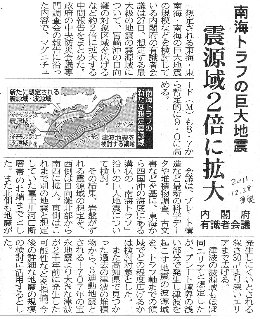 [2011_12_28_03]南海トラフの巨大地震 震源域2倍に拡大 内閣府有識者会議(東奥日報2011年12月28日)