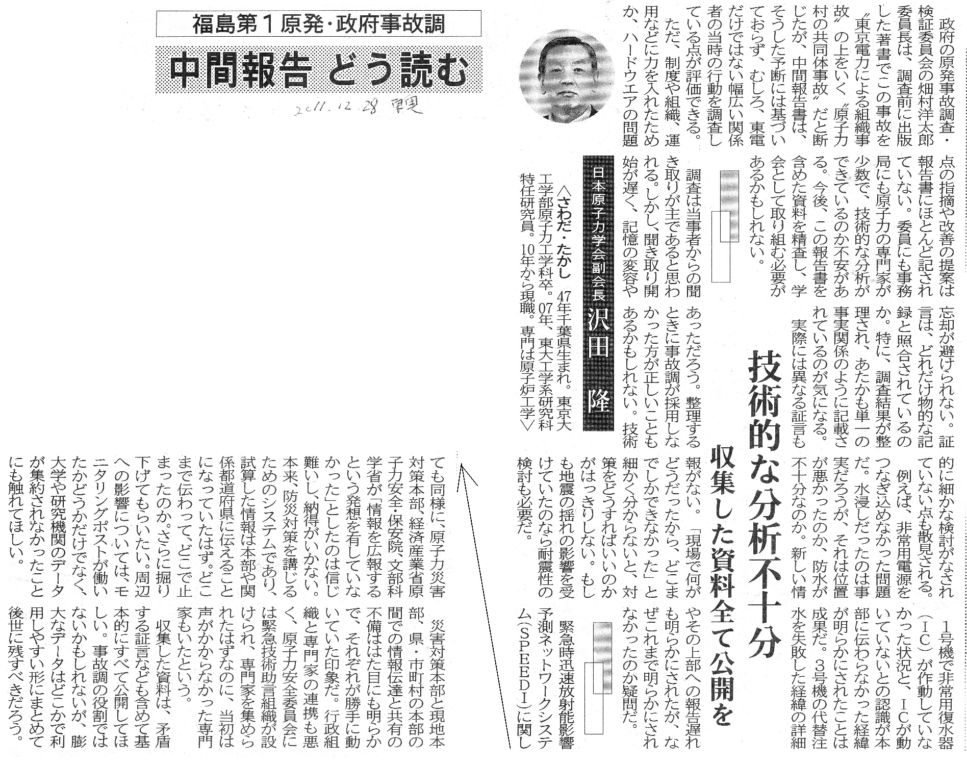 | [2011_12_28_04]福島第1原発・政府事故調 中間報告どう読む 日本原子力学会副会長 沢田隆 技術的な分析不十分 収集した資料全て公開を(東奥日報2011年12月28日) |