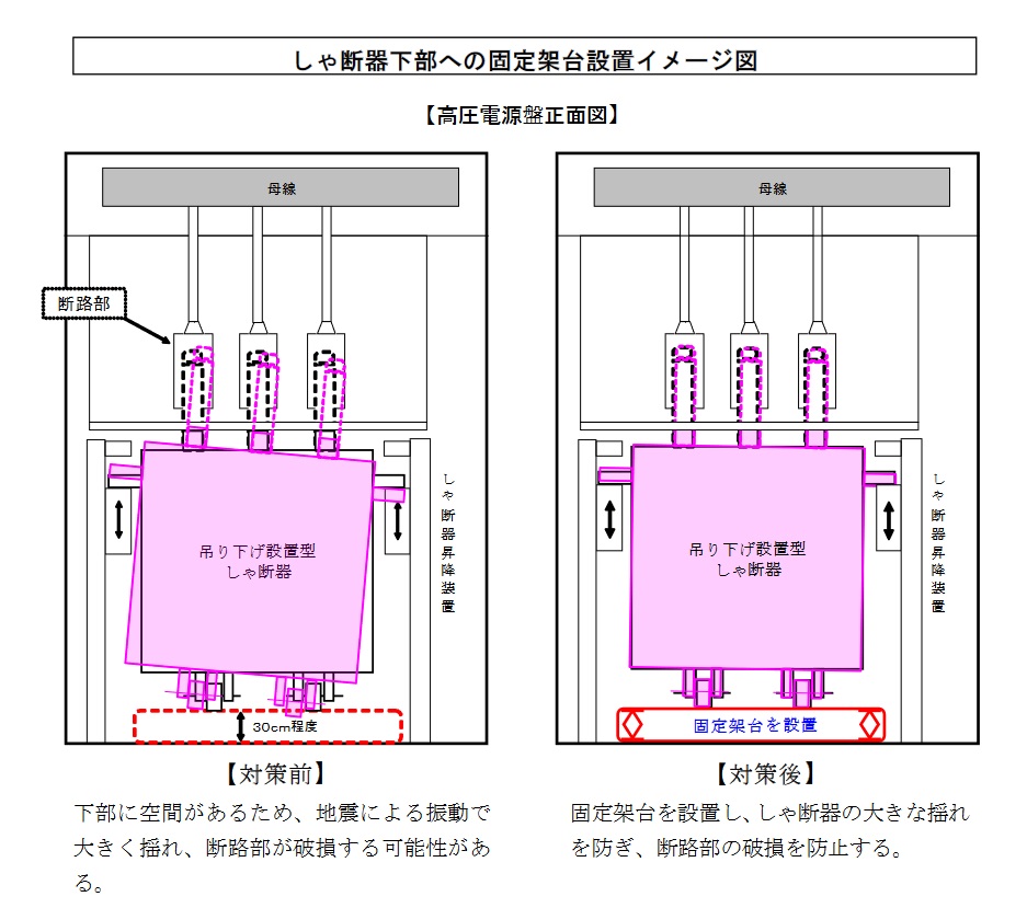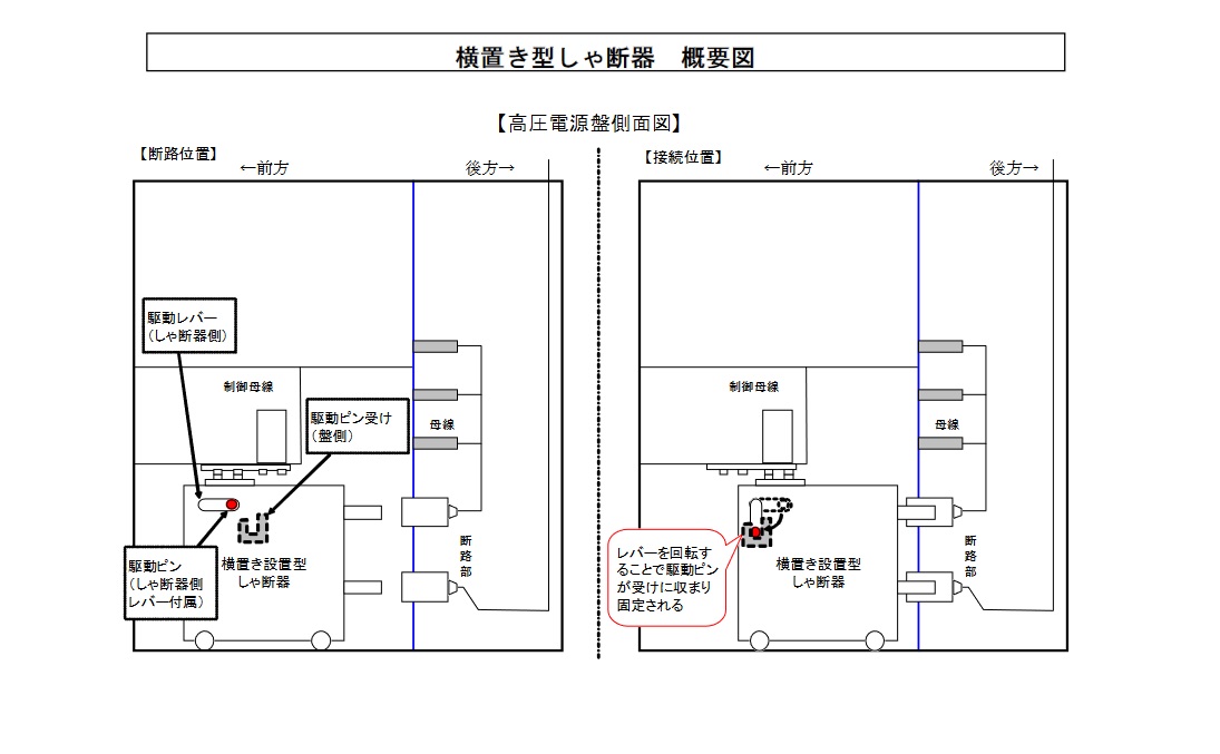 04:00 女川原子力発電所1号機は、東北地方太平洋沖地震により停止中のところ、3月11日15時30分、タービン建屋地下1階において、発煙を発見したことから、消火活動を行い、同日22時55分に消火を確認するとともに、高圧電源盤からの発煙であったことを確認しました。 火災の原因は、高圧電源盤内の吊り下げ設置型のしゃ断器※が、地震による振動で大きく揺れて断路部が破損し、周囲の構造物との接触により短絡等が生じ、発生した火花によって、高圧電源盤内のケーブルの絶縁被覆が溶け、発煙したものと推定しました。 本事象の再発防止対策として、火災により損傷した高圧電源盤については、横置き型で固定する機構があり耐震性の高い構造となっているしゃ断器を使用している設備に更新することとしております。 (平成23年5月30日お知らせ済み) 当社は、原子力安全・保安院からの指示文書「原子力発電所における吊り下げ設置型の高圧遮断器に係る火災防護上の必要な措置の実施等について(平成23年5月31日)」に基づき、本日、吊り下げ設置型のしゃ断器に関する火災防止の措置等について、報告しました。 女川原子力発電所1号機では、火災により焼損し現在使用していない9台を含め、合計25台の吊り下げ型しゃ断器を使用しております。 これらの全てについて、平成24年度末までに、横置き型で固定する機構があり耐震性の高い構造となっているしゃ断器を使用している設備に更新いたします。 また、設備の更新が完了するまでの火災発生防止策として、しゃ断器下部の空間への固定架台設置による揺れ止め等の措置を講じております。 なお、女川原子力発電所2、3号機および東通原子力発電所1号機については、吊り下げ設置型のしゃ断器は使用しておりません。 当社としては、今回策定した対策を確実に実施することで、火災発生の防止とともに、より一層の安全性向上に努めてまいります。 以 上 ※ 電気回路の接続や、過電流が流れた場合などに自動で電気回路を切り離す機器。 しゃ断器下部への固定架台設置イメージ図、横置き型しゃ断器概要図(PDFファイル/176KB) ![]() ![]() |