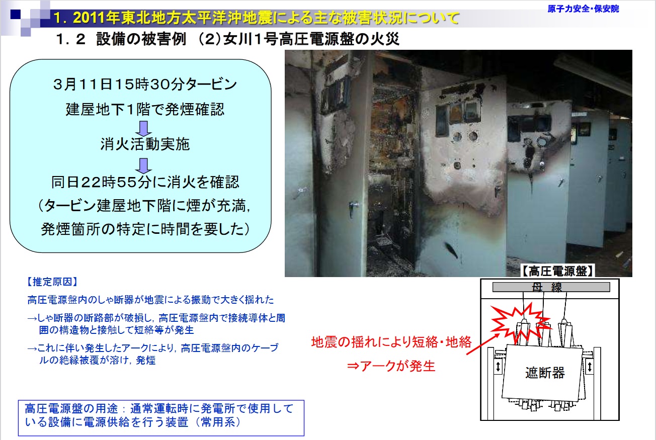 04:00 ![]() 1.2011年東北地方太平洋沖地震による主な被害状況について 1.1 地震・津波の状況 (5)設備の被害状況 区分 法令報告、火災 件数 4 被害概要 ・女川1号重油貯蔵タンクの倒壊【津波の影響】 ・女川1号高圧電源盤の火災【地震の影響】 ・女川1号非常用ディーゼル発電機(A)界磁電圧制御回路の損傷【地震影響】 ・女川2号原子炉建屋付属棟(非管理区域)への海水の流入(原子炉補機冷却系B系、高圧炉心スプレイ補機冷却水系の浸水)【津波影響】 ![]() 1.2011年東北地方太平洋沖地震による主な被害状況について 1.2 設備の被害例 (2)女川1号高圧電源盤の火災 3月11日15時30分タービン建屋地下1階で発煙確認 ーー> 消火活動実施 ーー> 同日22時55分に消火を確認(タービン建屋地下階に煙が充満、発煙箇所の特定に時間を要した) 【推定原因】 高圧電源盤内のしゃ断器が地震による震動で大きく揺れた ーー>しゃ断器の断路部が破損し、高圧電源盤内の接続導体と周囲の構造物と接触して短絡等が発生 -->これに伴い発生したアークにより、高圧電源盤内のケーブルの絶縁被膜が溶け、発煙 高圧電源盤の用途:通常運転時に発電所で使用している設備に電源供給を行う装置(常用系) ![]() 1.2011年東北地方太平洋沖地震による主な被害状況について 1.2 設備の被害例 (3)女川1号非常用ディーゼル発電機界磁電圧制御回路の損傷 4月1日:非常用ディーゼル発電機(A)の定期試験中の不具合に伴い、界磁電圧制御回路が損傷 5月18日:復旧 【推定原因】 女川1号高圧電源盤の火災 ーー>火災により同期検出継電器と接続しているケーブルが溶損し、地絡【@】 ーー>点検のため高圧電源盤からケーブルの切り離し作業中に高圧電源盤内の他のケーブルと接触し高圧電源盤から遮断機投入コイルに電圧が印加【A】 ーー>遮断機が投入され非常用ディーゼル発電機(A)が停止のまま所内電源系に接続【B】 ーー>非常用ディーゼル発電機(A)の磁界電圧制御回路が損傷【C】 |