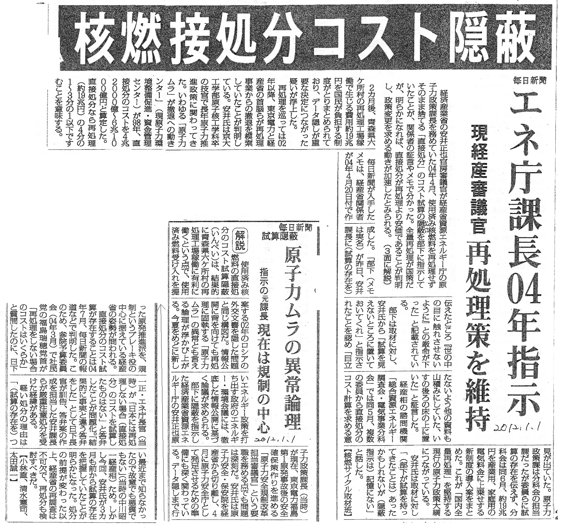 | [2012_01_01_01]核燃直接処分コスト隠蔽 エネ庁課長04年指示 現経産審議官 再処理策を維持 試算隠蔽 原子力ムラの異常論理 指示の元課長 現在は規制の中心(毎日新聞2012年1月1日) |