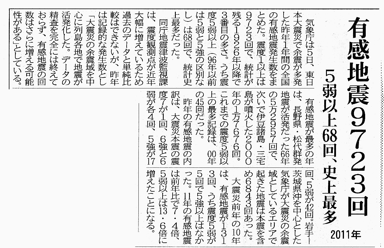 | [2012_01_06_02]有感地震9723回 5弱以上68回、史上最多 2011年(東奥日報2012年1月6日) |