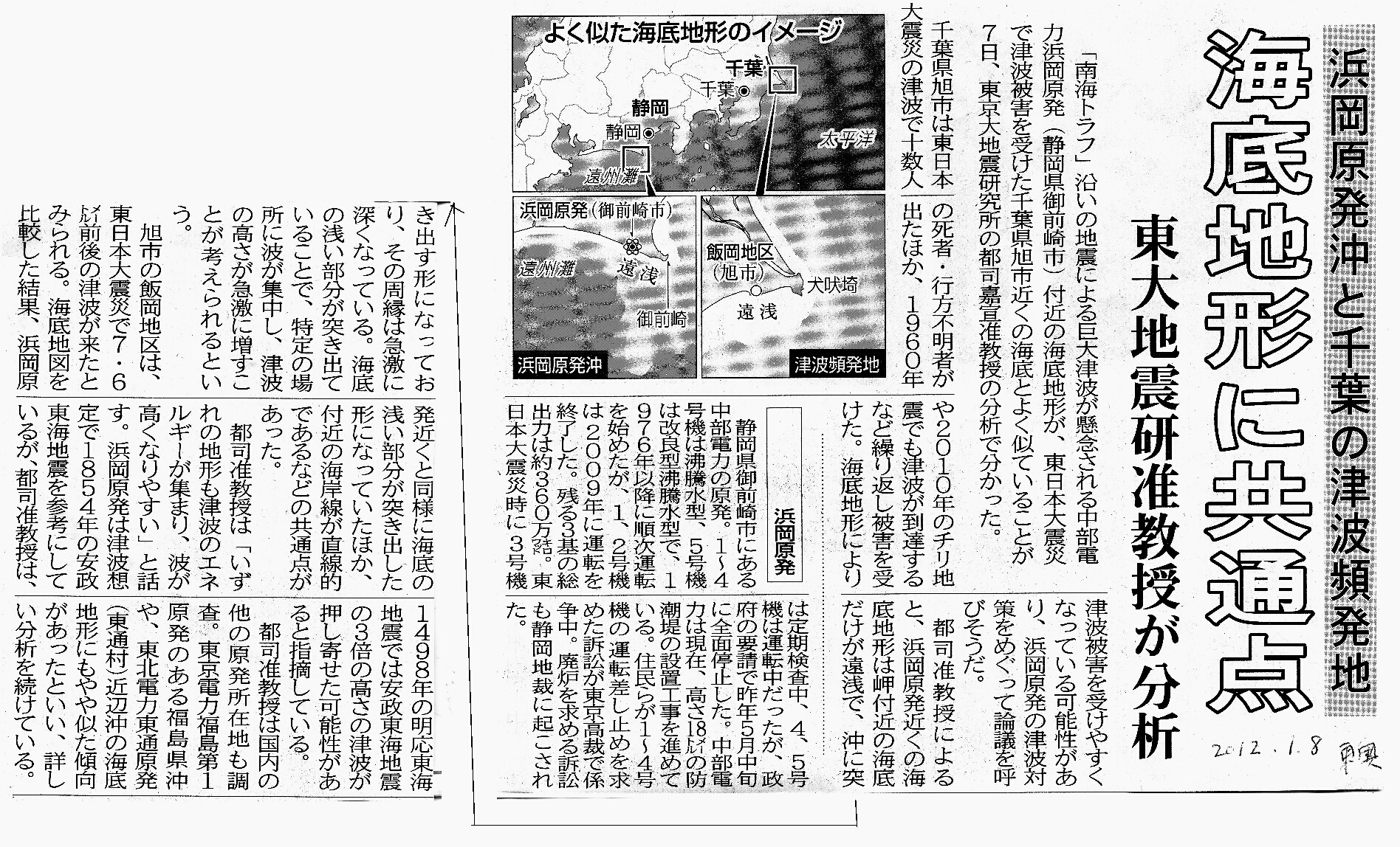 | [2012_01_08_01]浜岡原発沖と千葉の津波頻発地 海底地形に共通点 東大地震研准教授が分析(東奥日報2012年1月8日) |