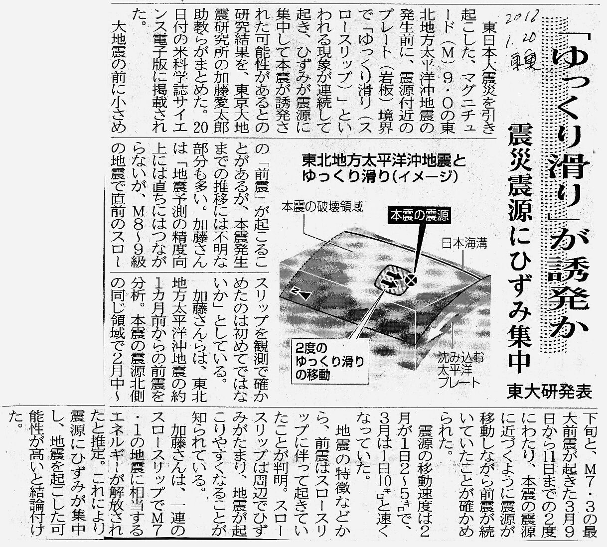 [2012_01_20_03]「ゆっくり滑り」が誘発か 震災震源にひずみ集中 東大研発表(東奥日報2012年1月20日)