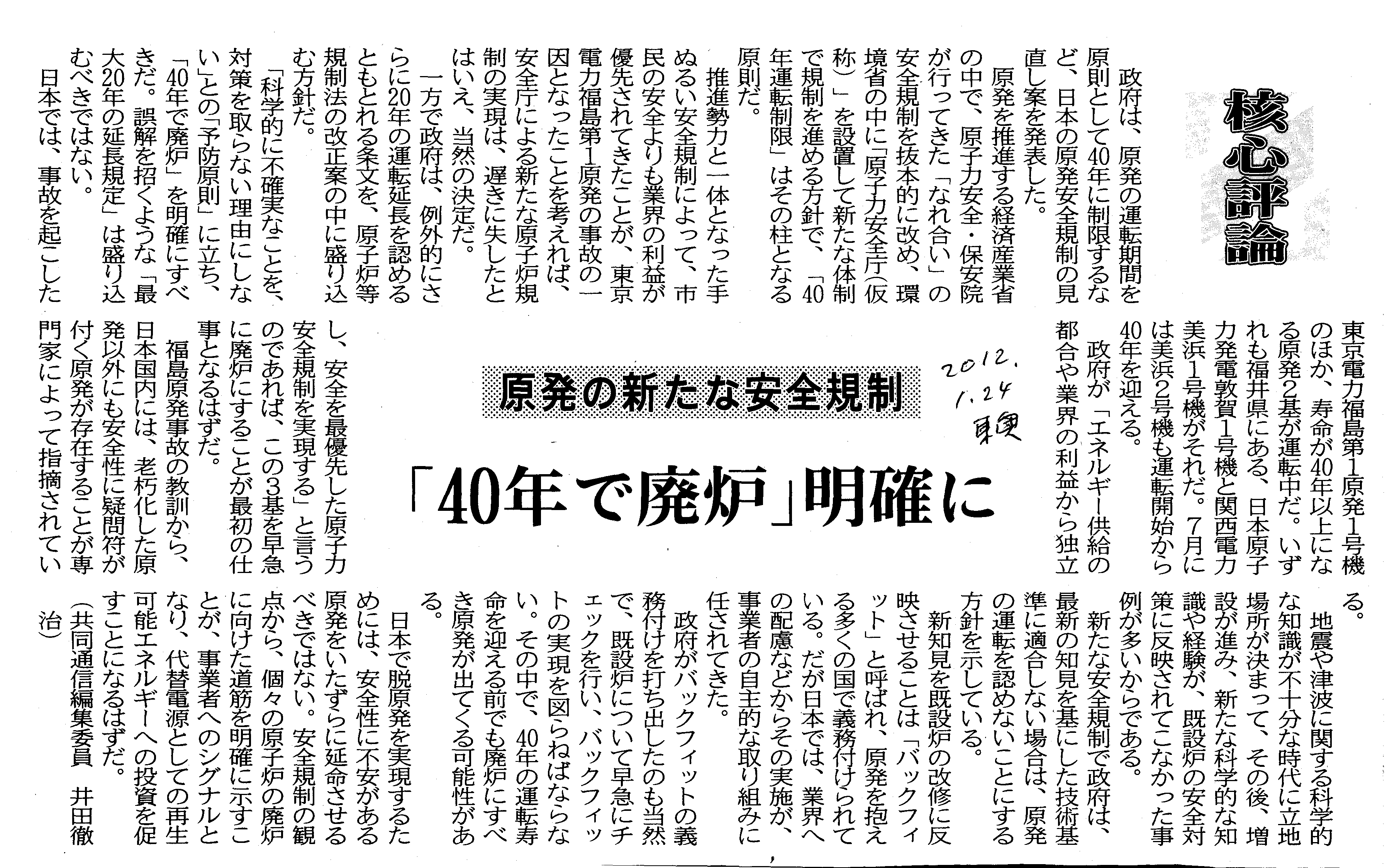 | [2012_01_24_01]核心評論 原発の新たな安全規制 「40年で廃炉」明確に(東奥日報 2012年1月24日) |