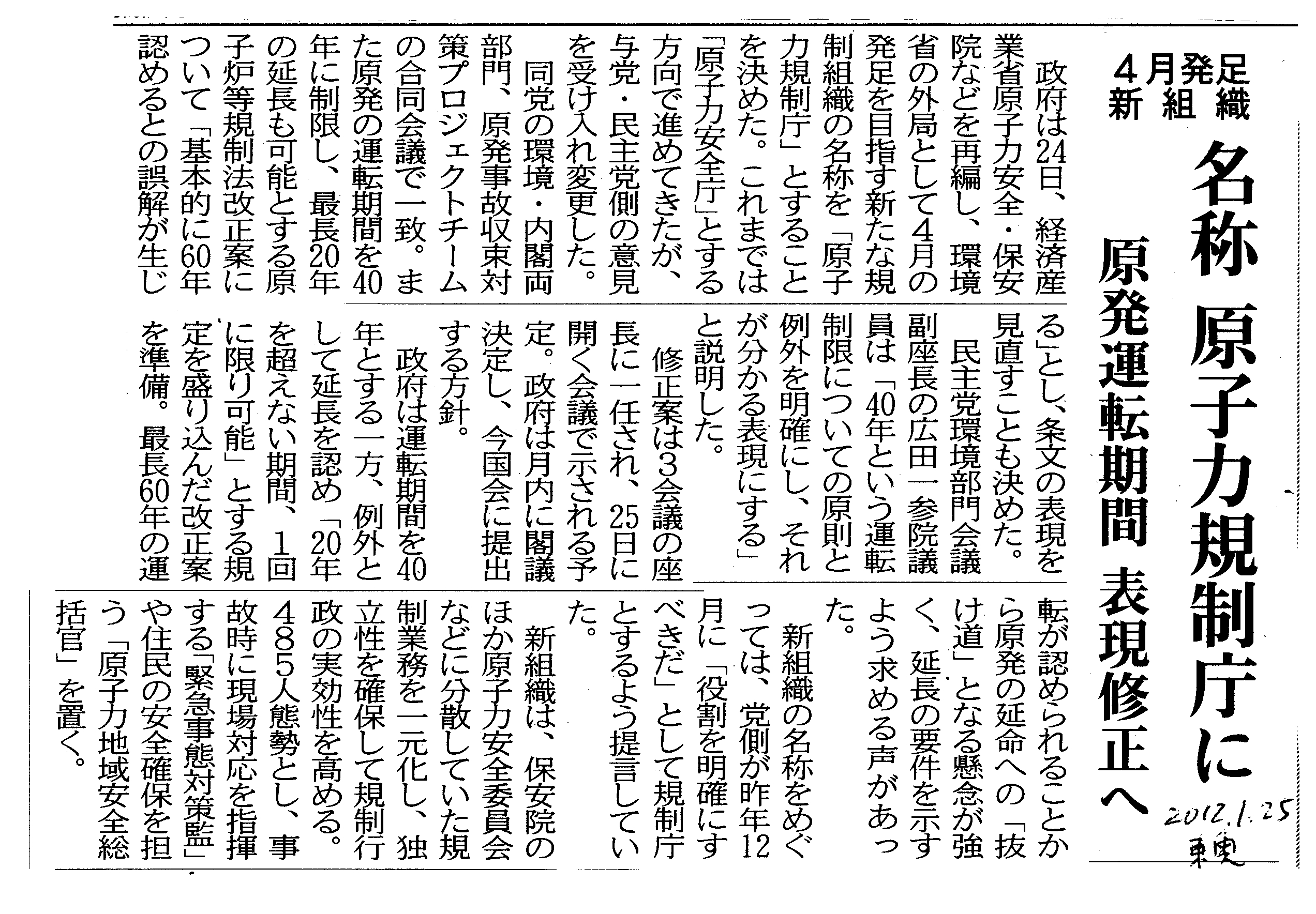 [2012_01_25_01]4月発足新組織 名称 原子力規制庁に(東奥日報2012年1月25日)