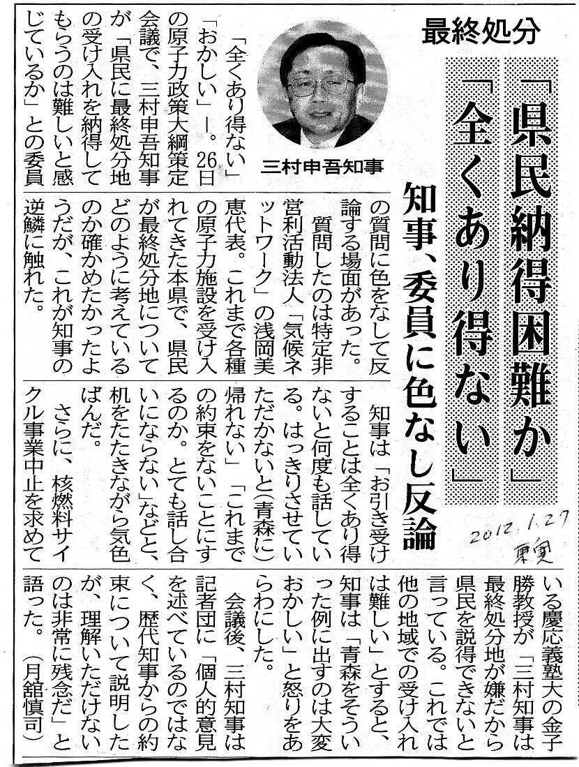 [2012_01_27_01]最終処分 「県民納得困難か」 「全くあり得ない」 知事、委員に色なし反論(東奥日報2012年1月27日)
