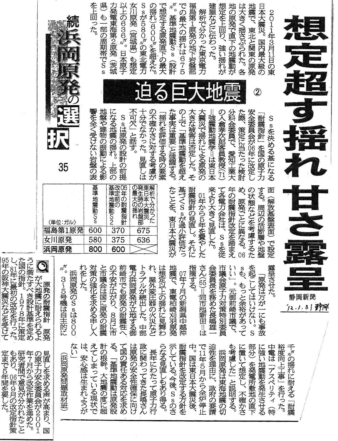[2012_01_31_01]想定こす揺れ 甘さ露呈 迫る巨大地震 続浜岡原発の選択(静岡新聞2012年1月31日)
