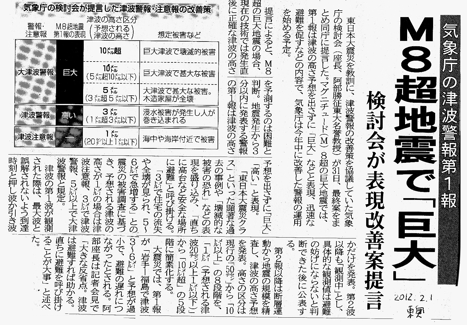 | [2012_02_01_01]気象庁の津波警報第一報 M8超地震で「巨大」 検討会が表現改善案提言(東奥日報2012年2月1日) |