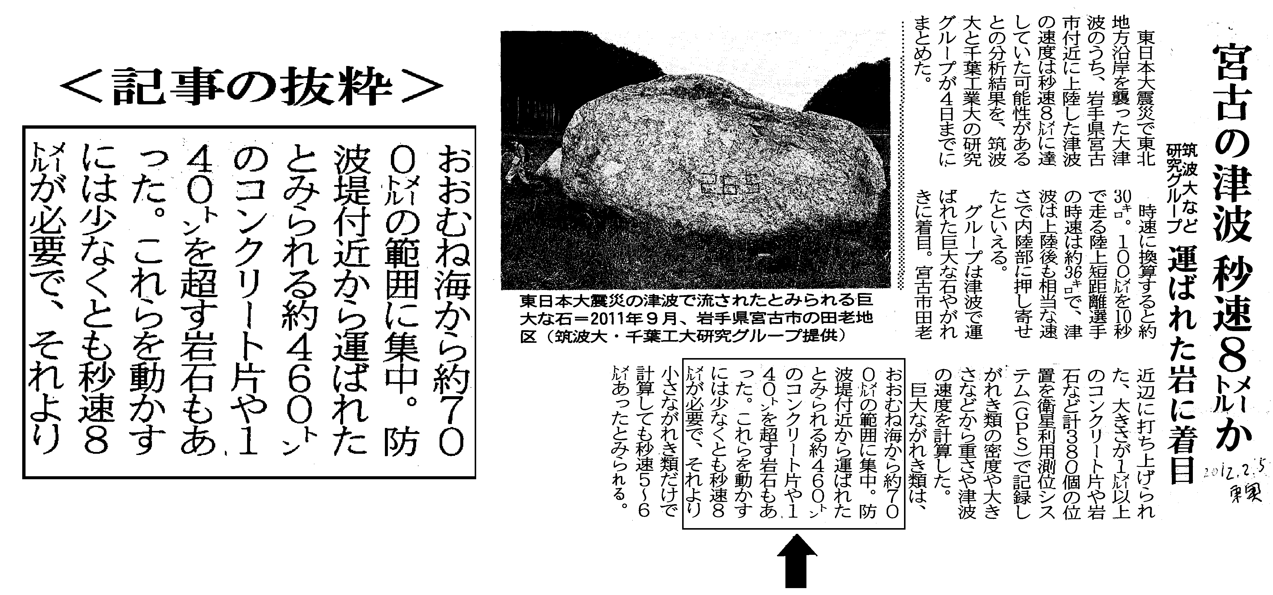 | [2012_02_05_01]宮古の津波 秒速8mか 運ばれた岩に着目(東奥日報2012年2月5日) |
