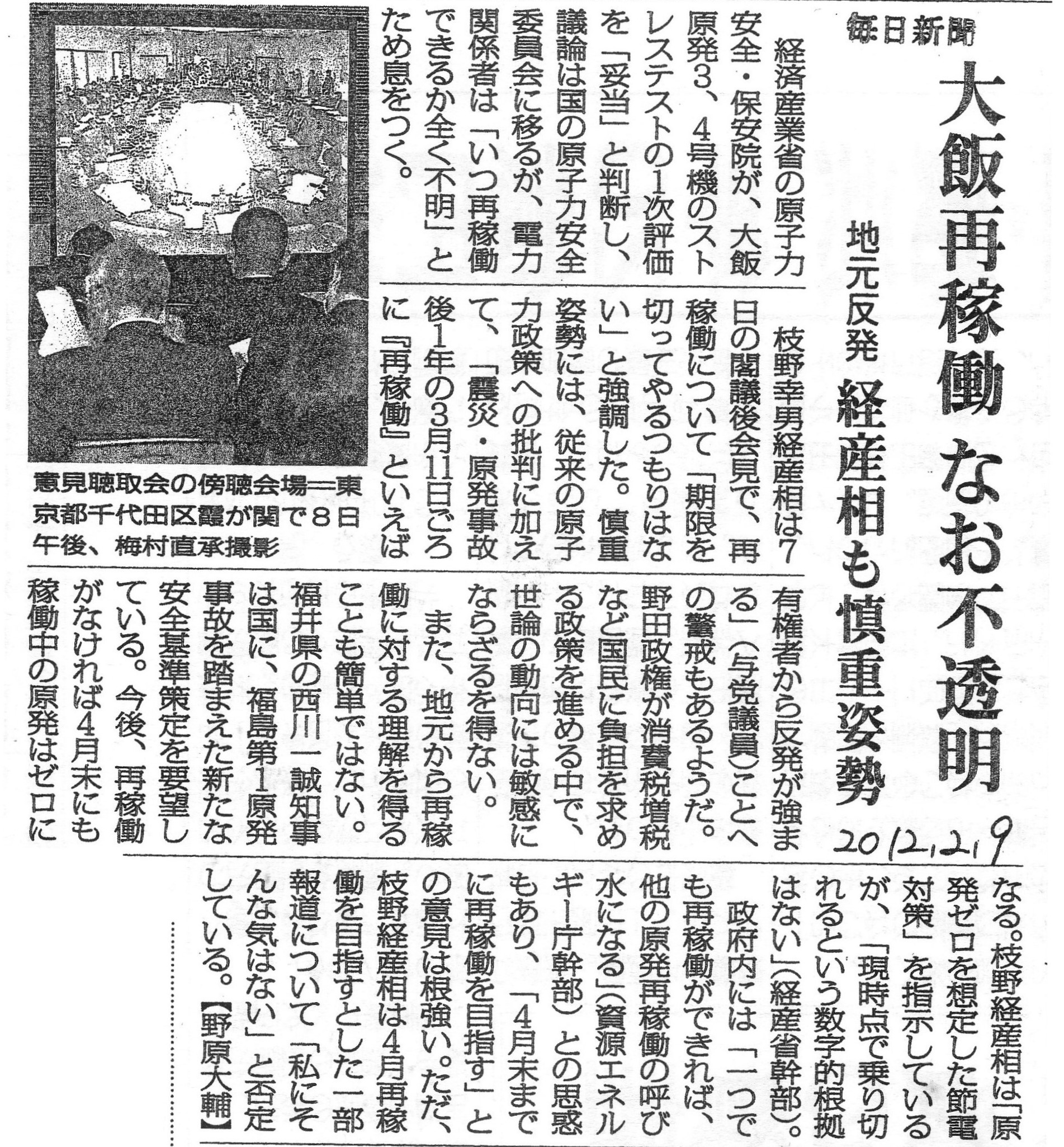 [2012_02_09_01]大飯再稼働 なお不透明 地元反発 経産相も慎重姿勢(毎日新聞2012年2月9日)