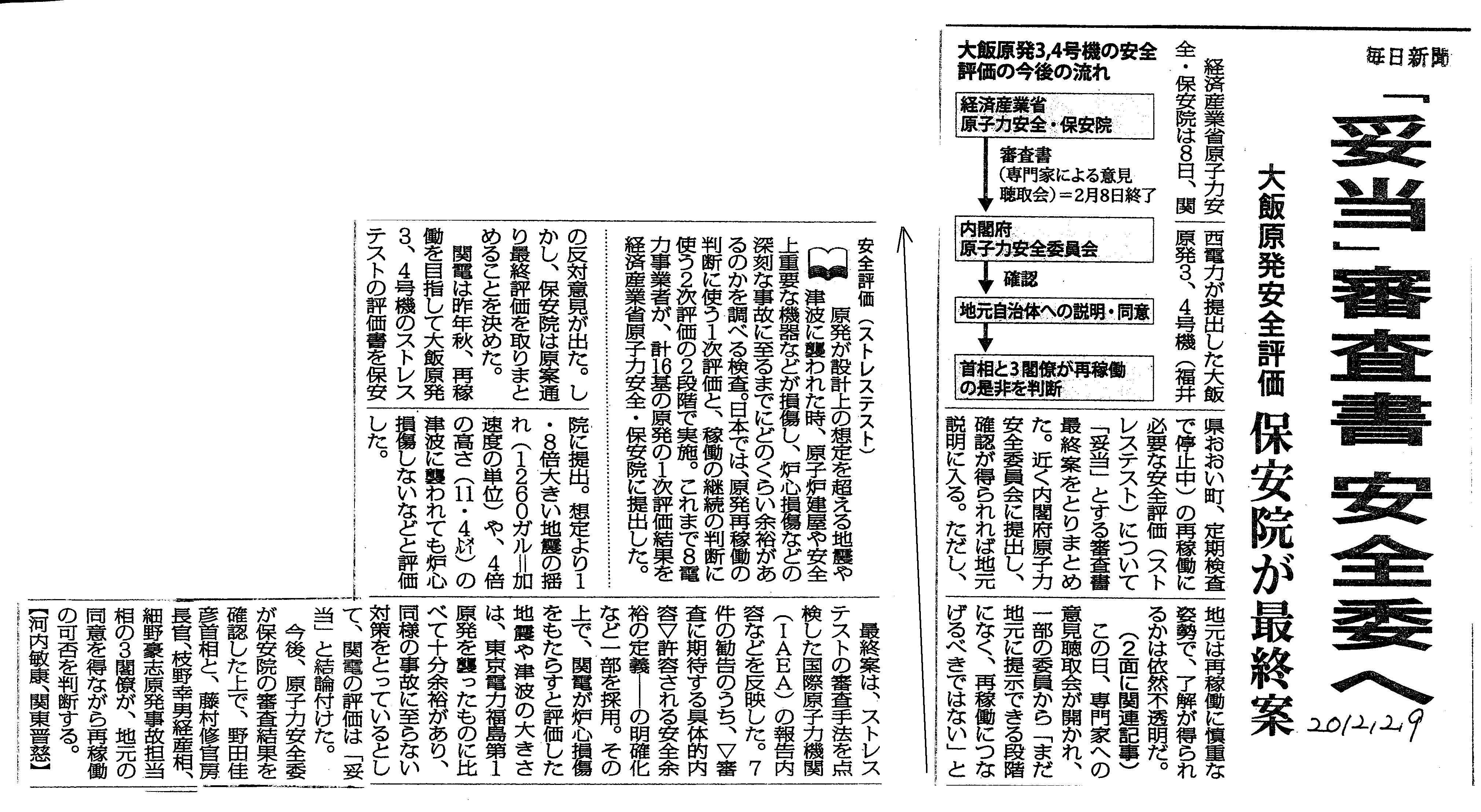 [2012_02_09_02]「妥当」審査書 安全委へ 大飯原発安全評価 保安院が最終案(毎日新聞2012年2月9日)