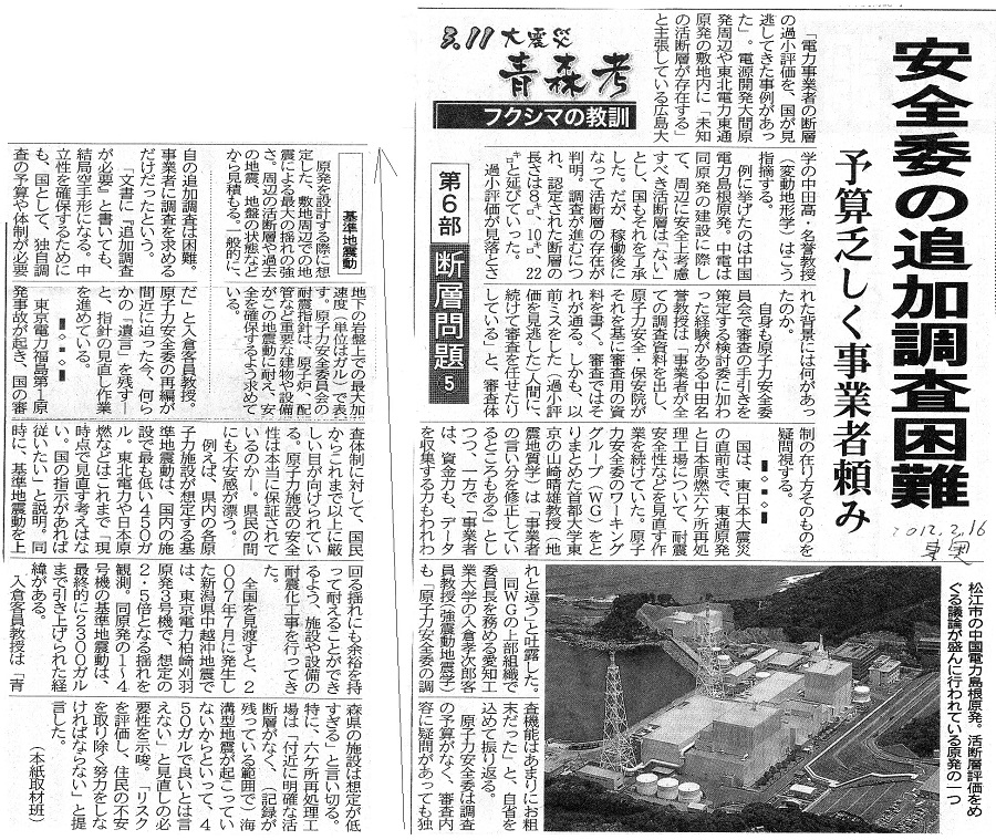 | [2012_02_16_03]3.11大震災 青森考 フクシマの教訓 第6部 断層問題5 安全委の追加調査困難 予算乏しく事業者頼み (東奥日報2012年2月16日) |