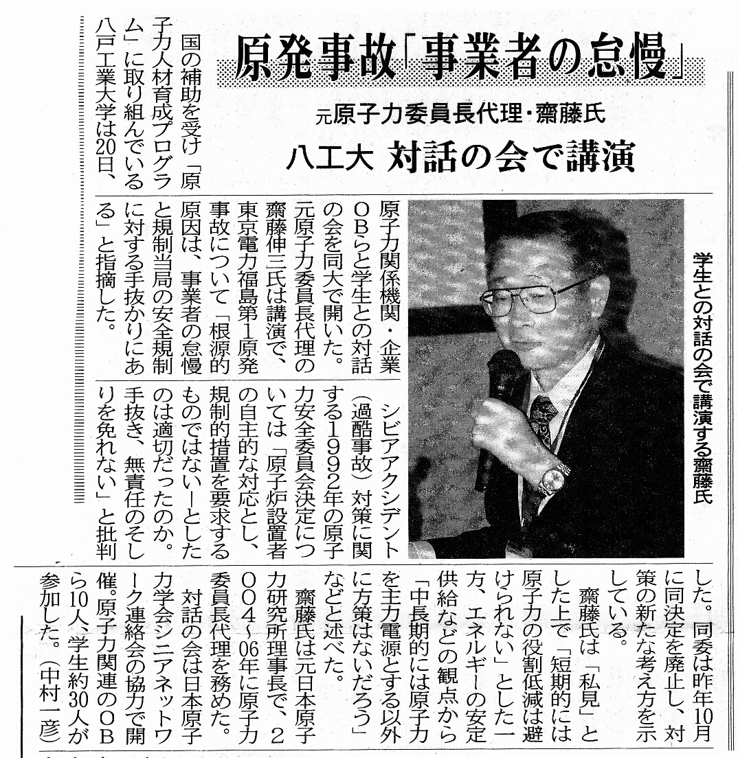 KEY_WORD:八戸工業大学:齋藤伸三:東京電力福島第1原発事故:シビアアクシデント:元日本原子力研究所理事長:対話の会:日本原子力学会シニアネットワーク連絡会