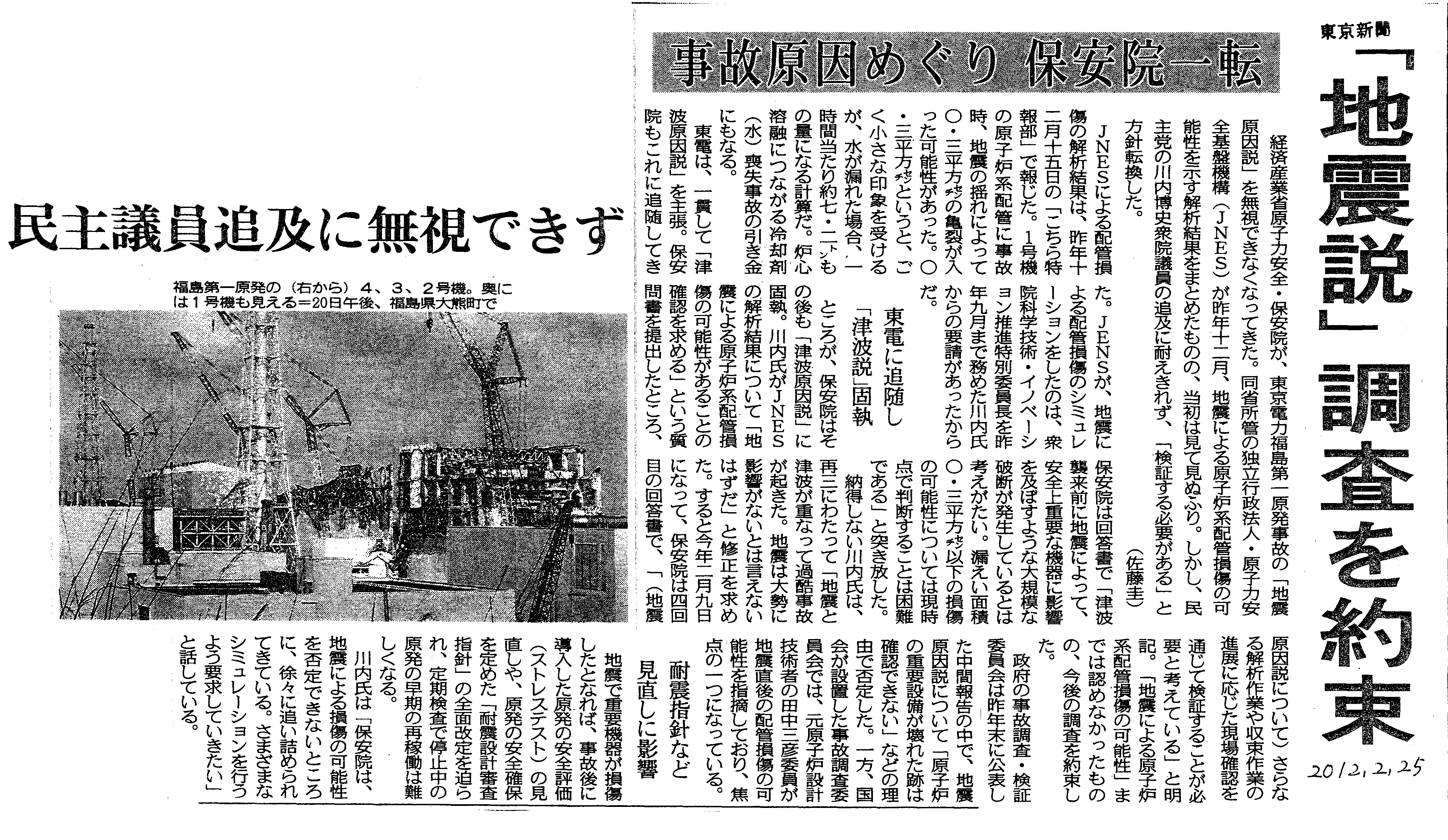 [2012_02_25_01]事故原因めぐり 保安院一転 「地震説」調査を約束(東京新聞2012年2月25日)
