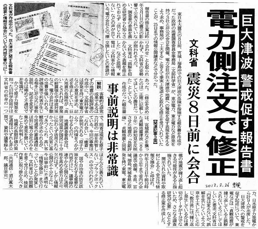 | [2012_02_26_01]巨大津波 警戒促す報告書 電力側注文で修正 文科省 震災8日前に会合 事前報告は非常識(東奥日報2012年2月26日) |