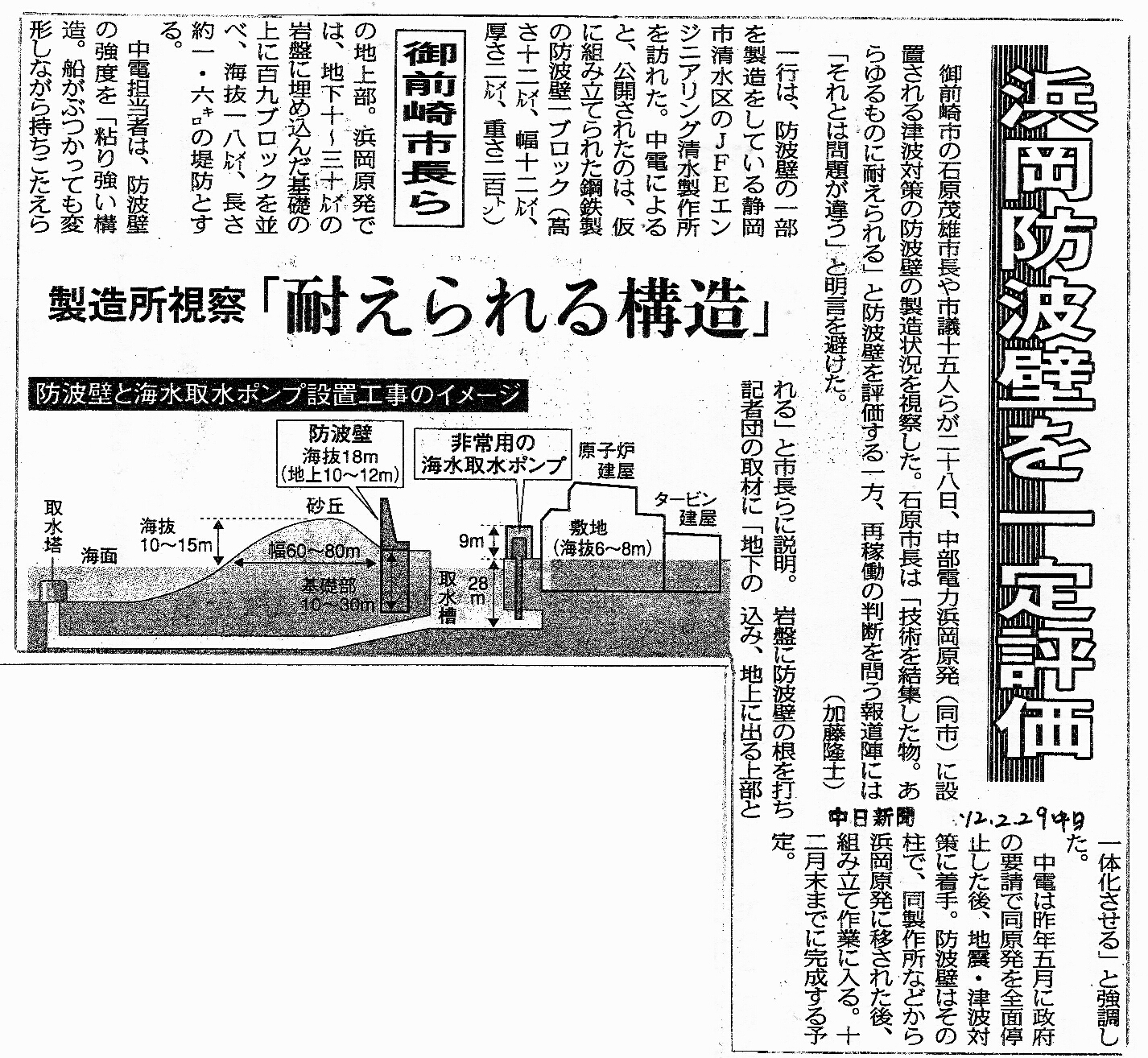 [2012_02_29_01]浜岡防波壁を一定評価 御前崎市町 製造所視察 「耐えられる構造」(中日新聞2012年2月29日)