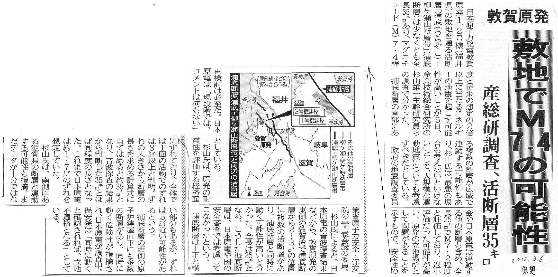 | [2012_03_06_01]敦賀原発 敷地でM7.4の可能性 参総研調査、活断層35キロ(東奥日報2012年3月6日) |
