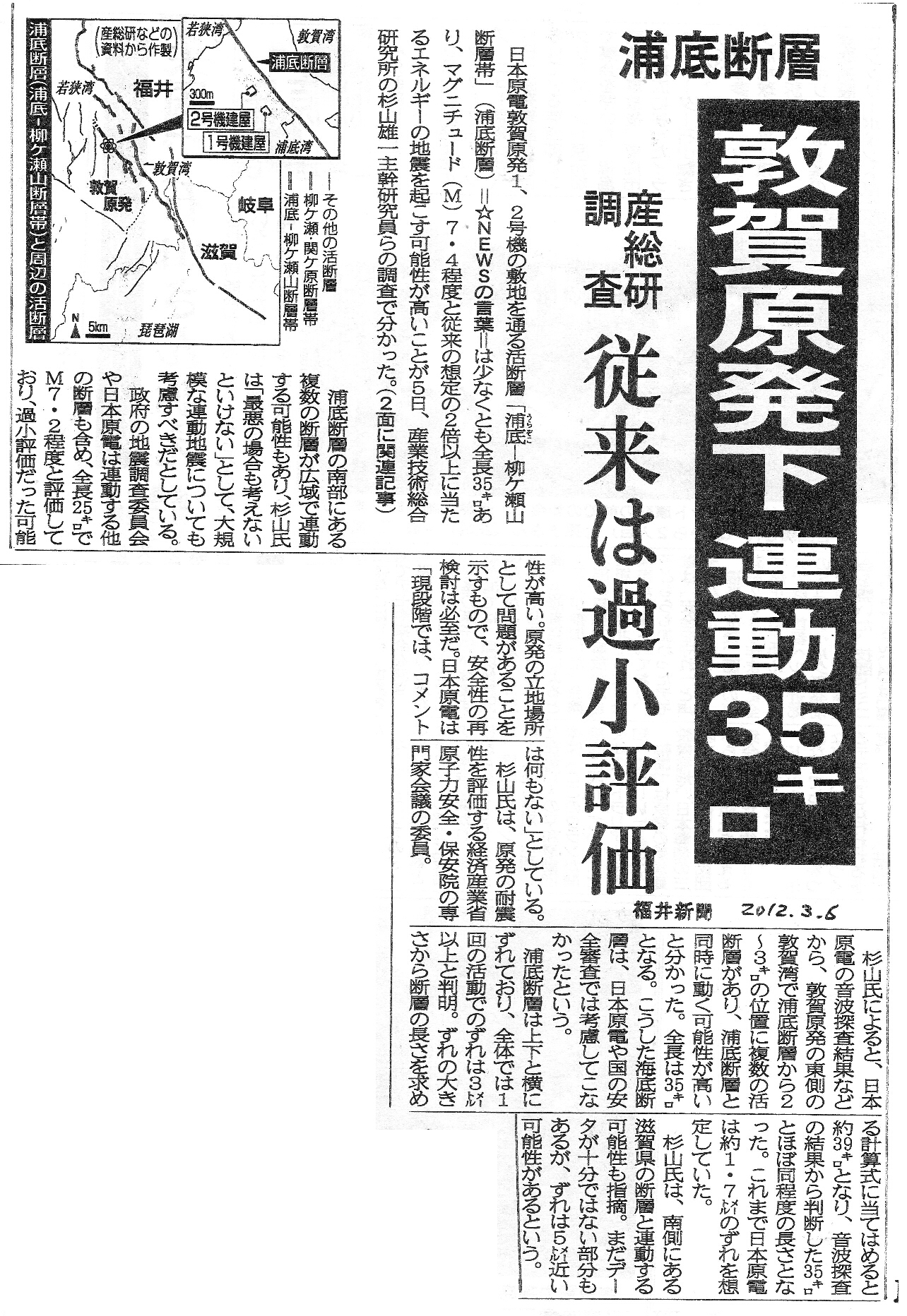 | [2012_03_06_03]浦底断層 敦賀原発下連動35キロ 参総研調査 従来は過小評価(福井新聞2012年3月6日) |