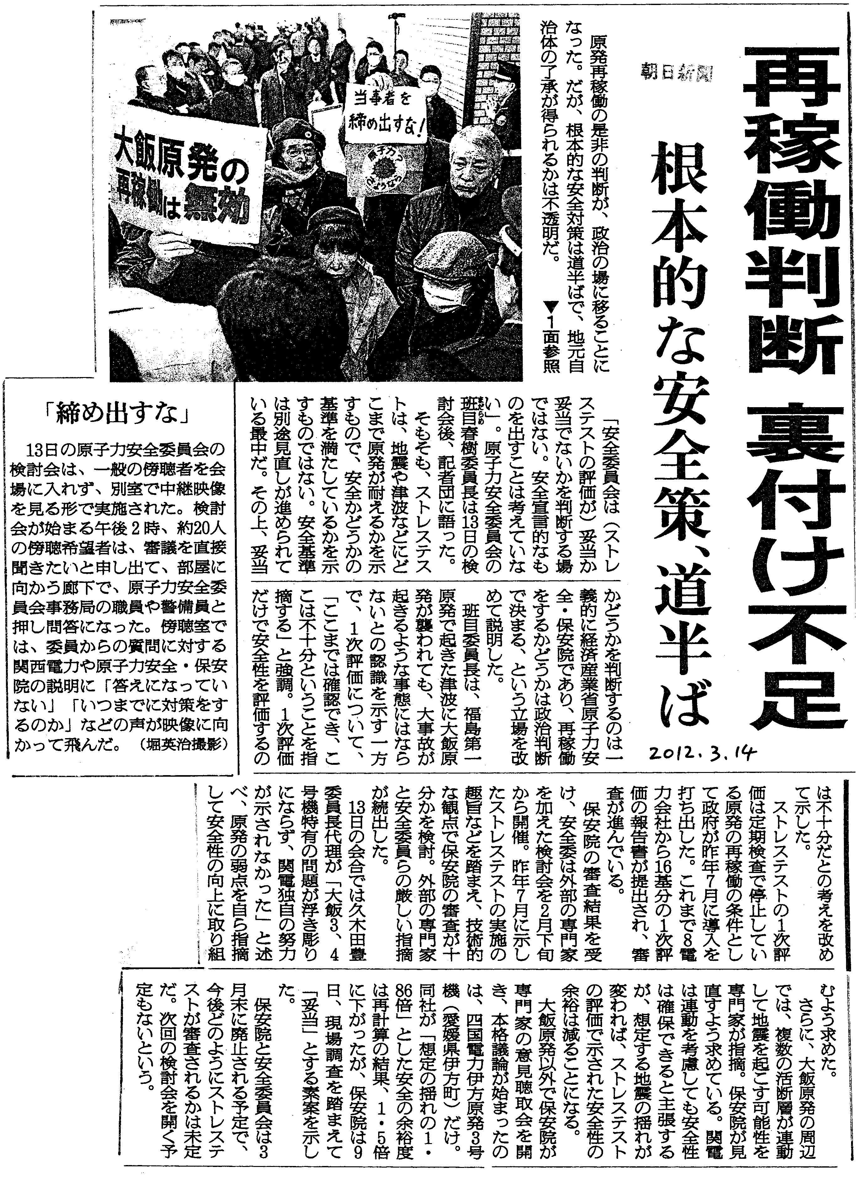 [2012_03_14_01]再稼働判断 裏付け不足 根本的な安全策、道半ば (朝日新聞2012年3月14日)