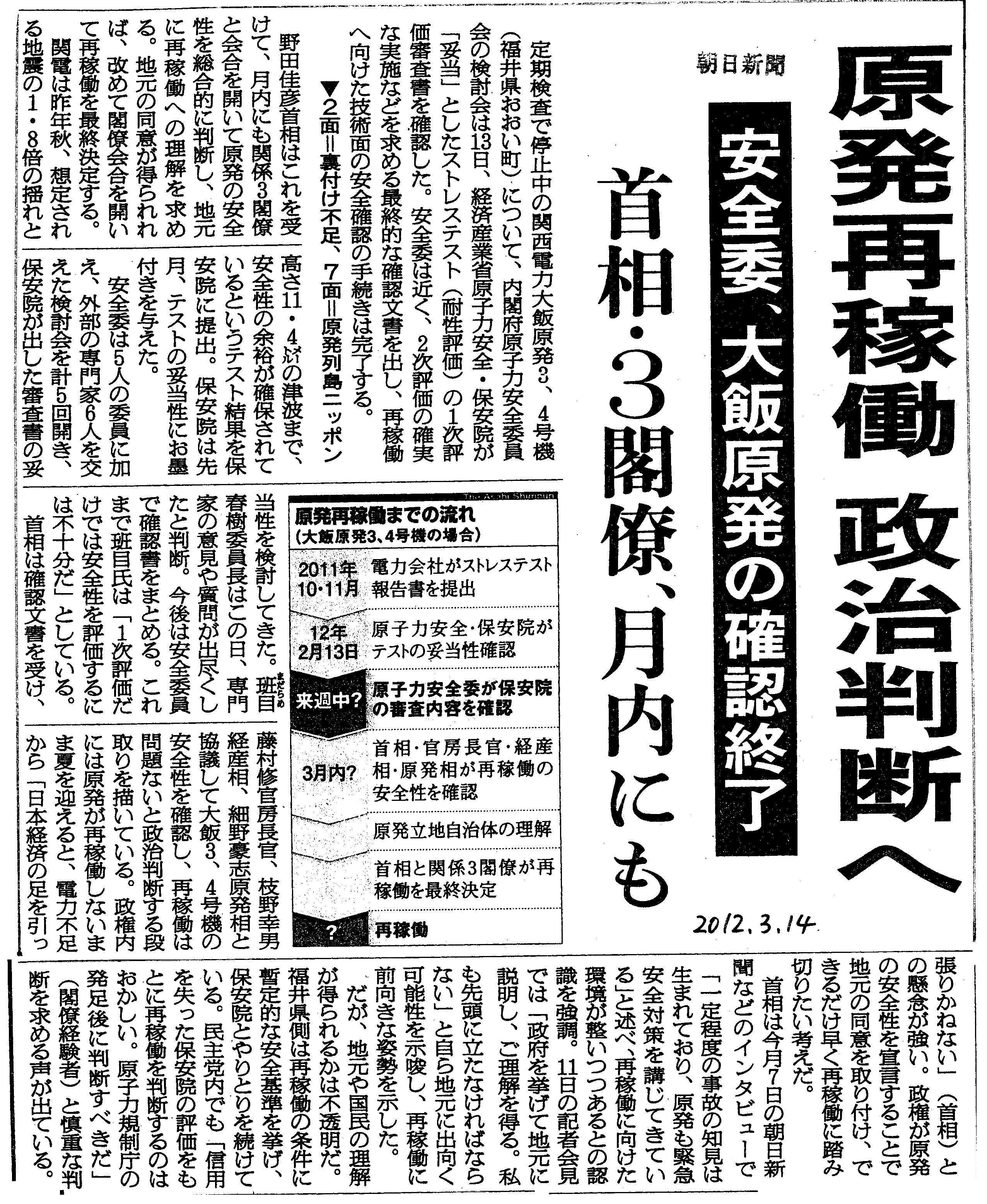 [2012_03_14_02]安全委、大飯原発の確認終了 首相・3閣僚、月内にも (朝日新聞2012年3月14日)