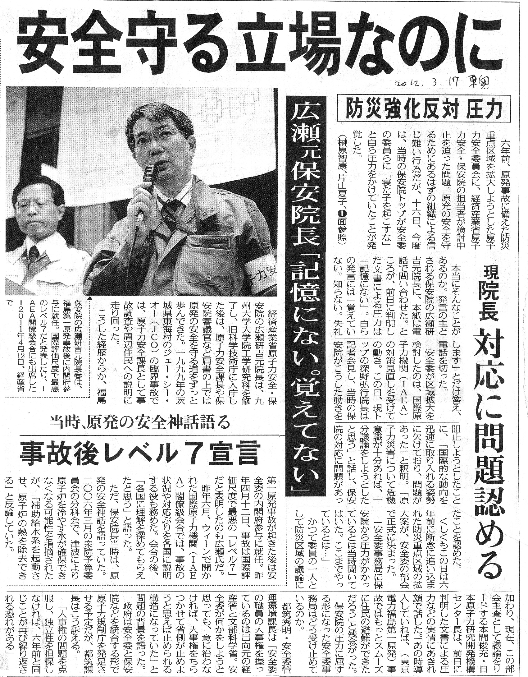 [2012_03_17_02]安全守る立場なのに 防災強化反対 圧力 広瀬元保安院長「記憶にない。覚えていない」 現院長 対応に問題認める 当時、原発の安全神話語る 事故後レベル7宣言(東奥日報2012年3月17日)