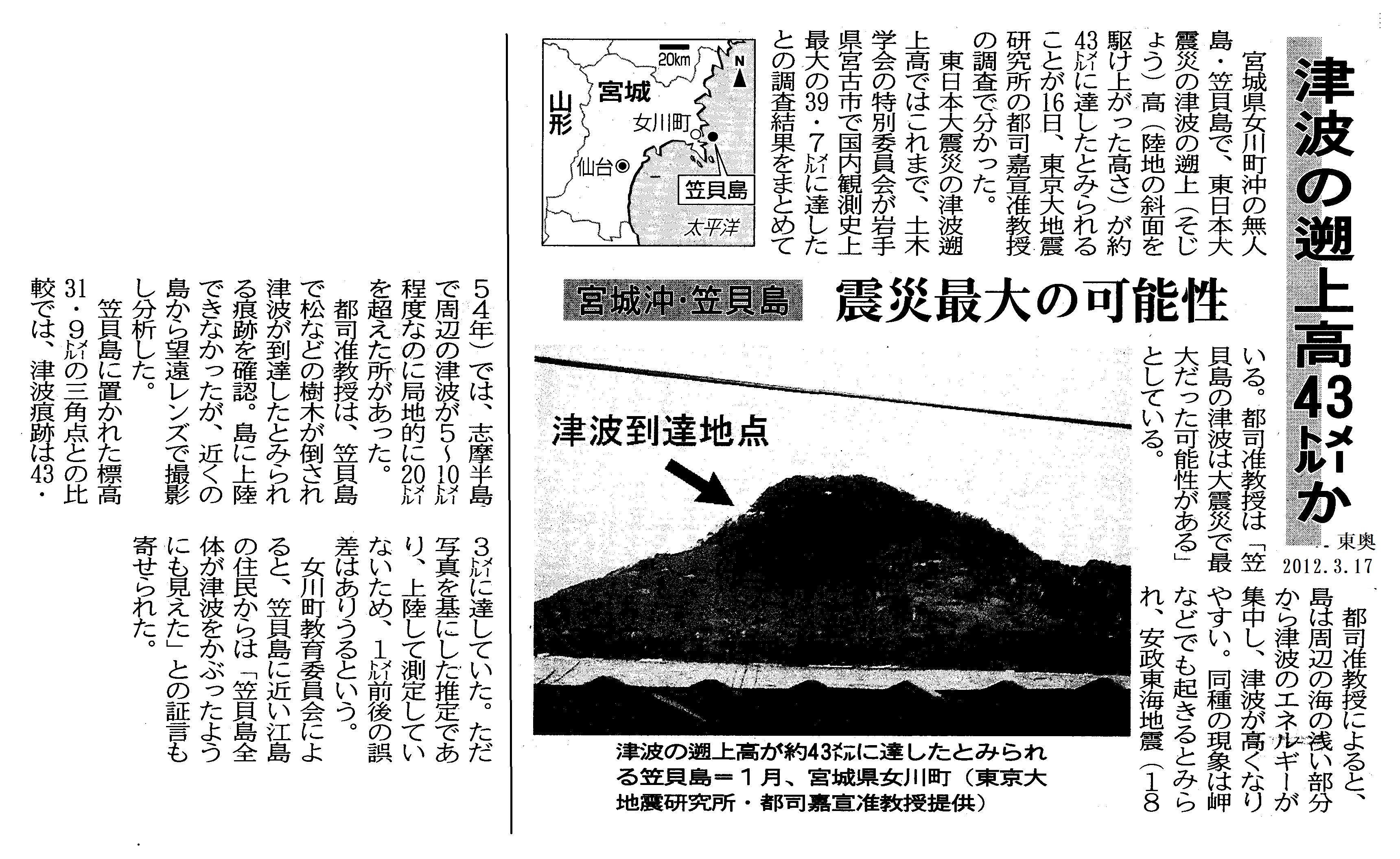 | [2012_03_17_04]宮城沖・笠貝島 津波遡上高43Mか 震災最大の可能性 (東奥日報2012年3月17日) |
