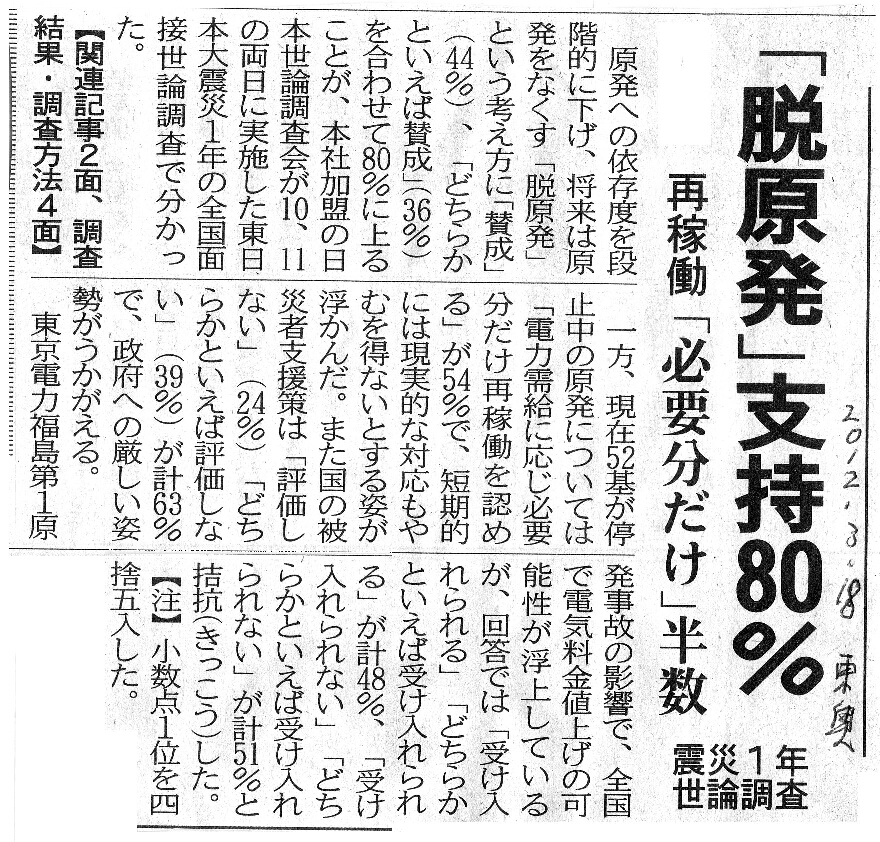 [2012_03_18_01]「脱原発」支持80% 再稼働「必要分だけ」半数 震災1年世論調査(東奥日報2012年3月18日)