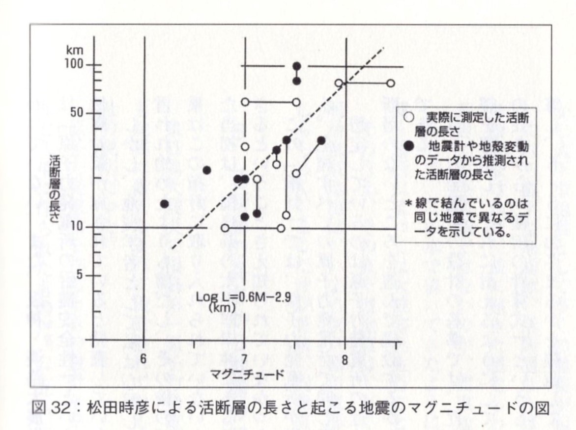 第7章 活断層はどのくらい警戒すべきだろうか 5 活断層の長さから地震のマグニチュードを見積もる「まやかし」 図32:松田時彦による活断層の長さと起こる地震のマグニチュードの図