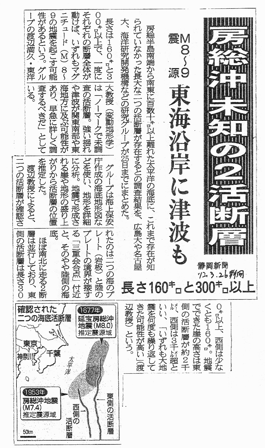 | [2012_03_26_01]房総沖 未知の2活断層 M8〜9震源 東海沿岸に津波も 長さ160キロと300キロ以上(静岡新聞2012年3月26日) |