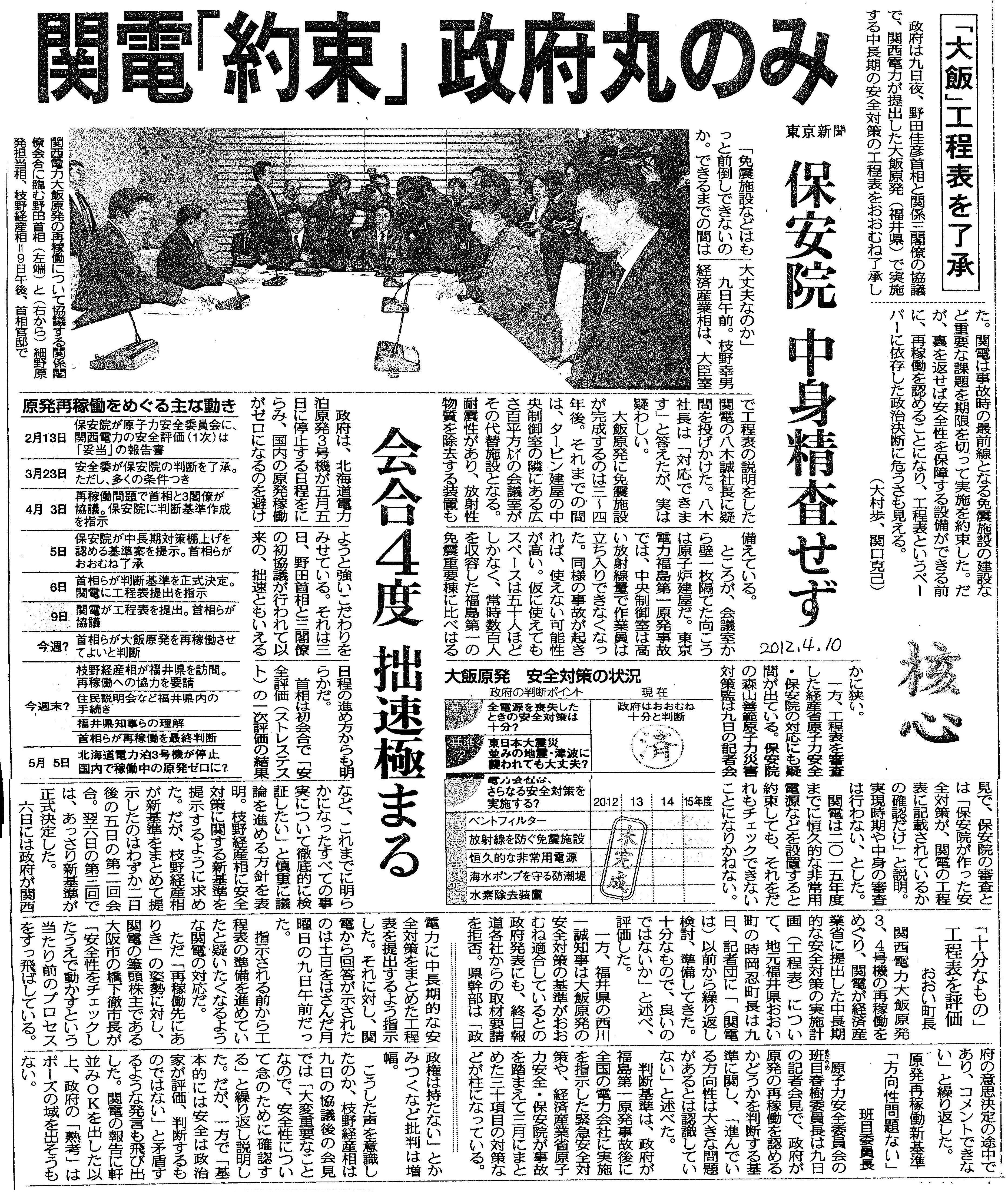 | [2012_04_10_01]関電「約束」 政府丸のみ 「大飯」工程表を了承 保安院 中身精査せず (東京新聞2012年4月10日) |