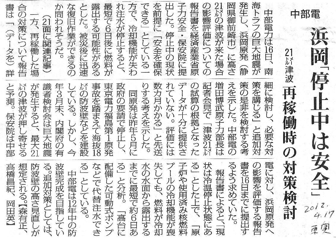 | [2012_04_17_02]中部電 浜岡「停止中は安全」 21メートル津波 再稼働時の対策検討 経済産業省原子力安全・保安院 (東奥日報2012年4月17日) |