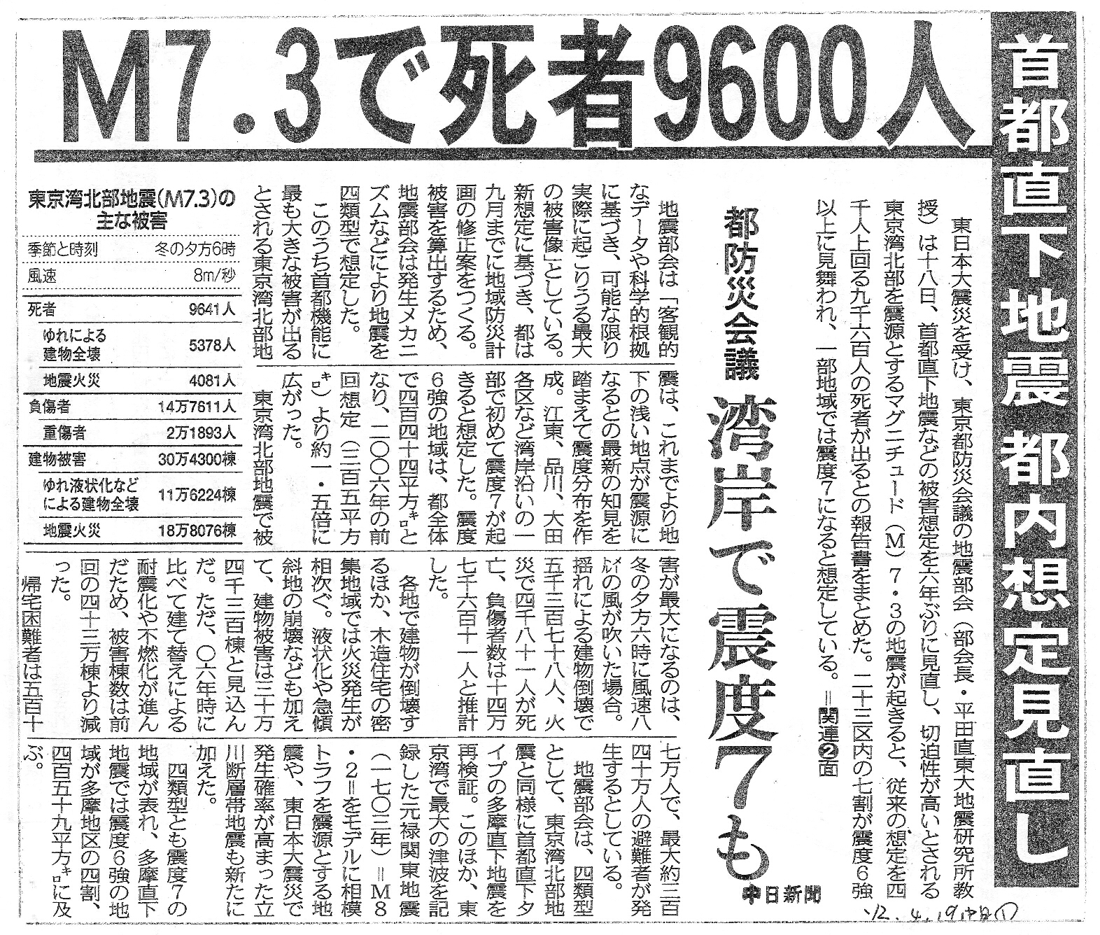 [2012_04_19_01]M7.3で死者9600人 首都直下地震 都内想定見直し 都防災会議 湾岸で震度7も(中日新聞2012年4月19日)