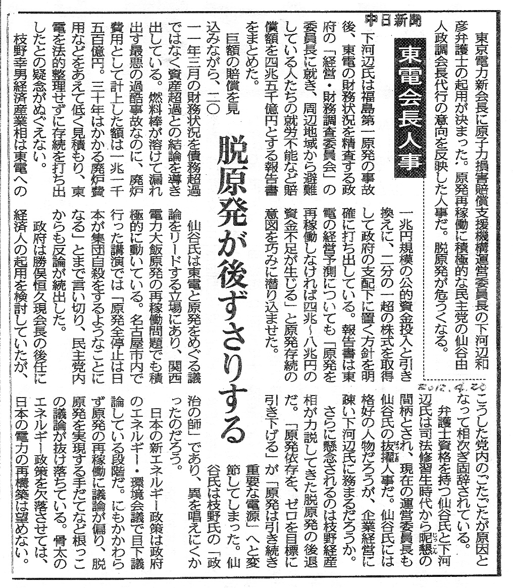 [2012_04_20_01]東電会長人事 脱原発が後ずさりする(中日新聞2012年4月20日)