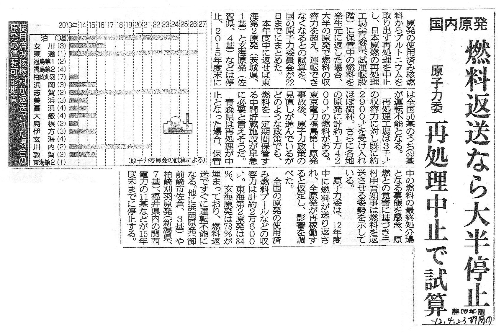 [2012_04_23_02]国内原発 燃料返送なら大半停止 原子力委 再処理中止で試算(静岡新聞2012年4月23日)