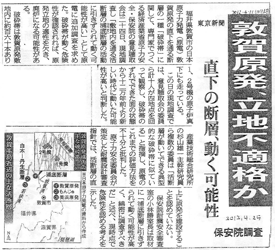 | [2012_04_25_02]敦賀原発、立地不適格か 直下の断層、動く可能性 保安院調査(東京新聞2012年4月25日) |