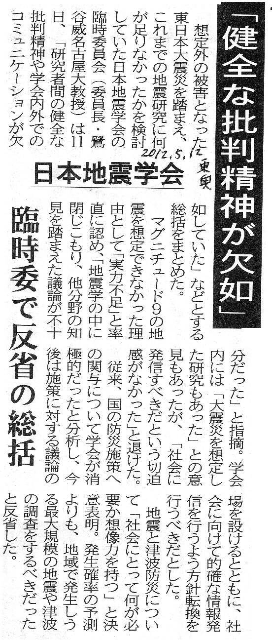 | [2012_05_12_01]「健全な批判精神が欠如」 日本地震学会 臨時委で反省の総括(東奥日報2012年5月12日) |