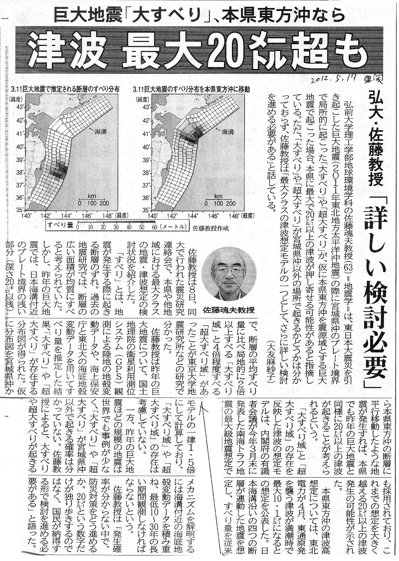 | [2012_05_17_02]巨大地震「大すべり」、本県東方沖なら 津波 最大20メートル超も 弘大・佐藤教授「詳しい検討必要」(東奥日報2012年5月17日) |
