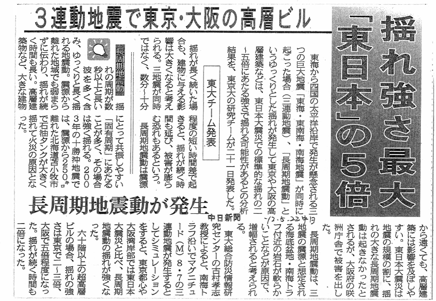 [2012_05_22_02]3連動地震で東京・大阪の高層ビル 揺れ強さ最大「東日本」の5倍 長周期地震動が発生 東大チーム発表(中日新聞2012年5月22日)