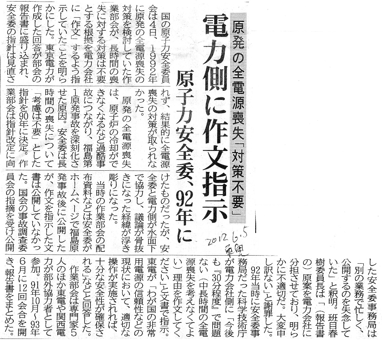 [2012_06_05_01]原発の全電源喪失「対策不要」 電力側に作文指示 原子力安全委、92年(東奥日報2012年6月5日)