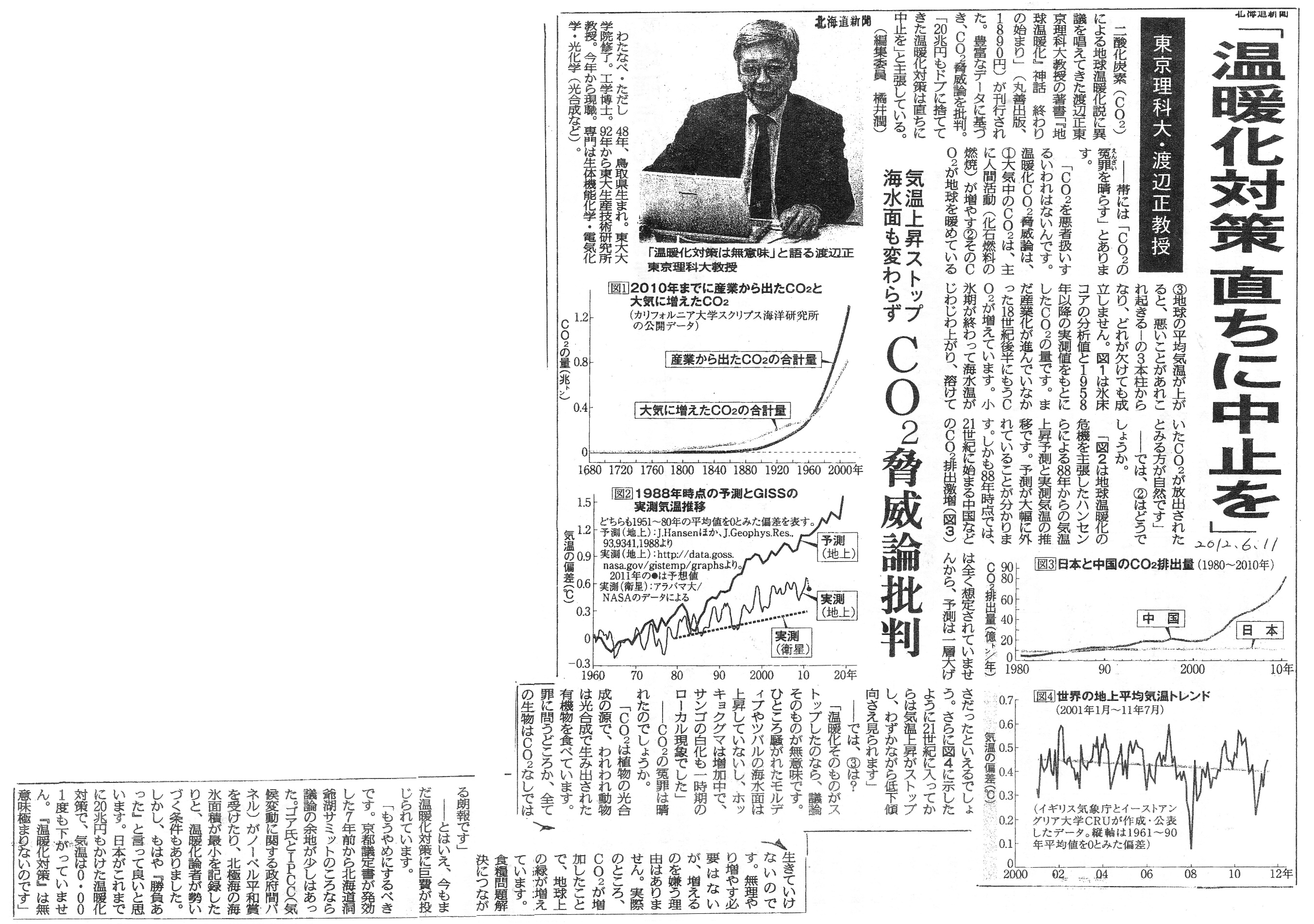 [2012_06_11_01]「温暖化対策 直ちに中止を」 東京理科大・渡辺正教授 気温上昇ストップ 海水面も変わらず CO2脅威論批判(北海道新聞2012年6月11日)