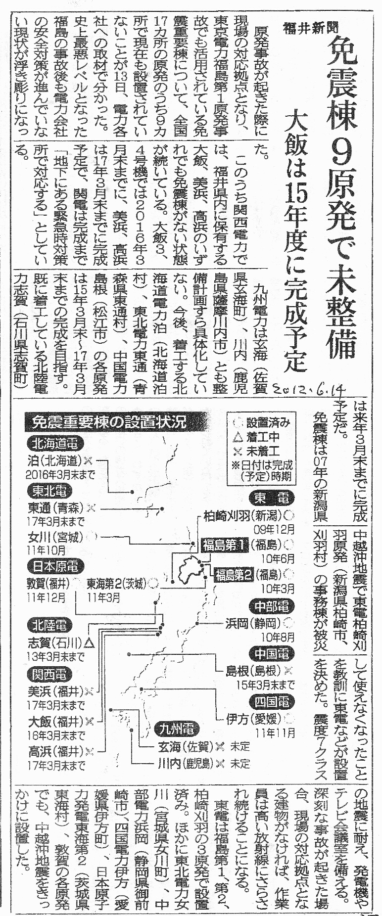 | [2012_06_14_01]免震棟9原発で未整備 大飯は15年に完成予定(福井新聞2012年6月14日) |