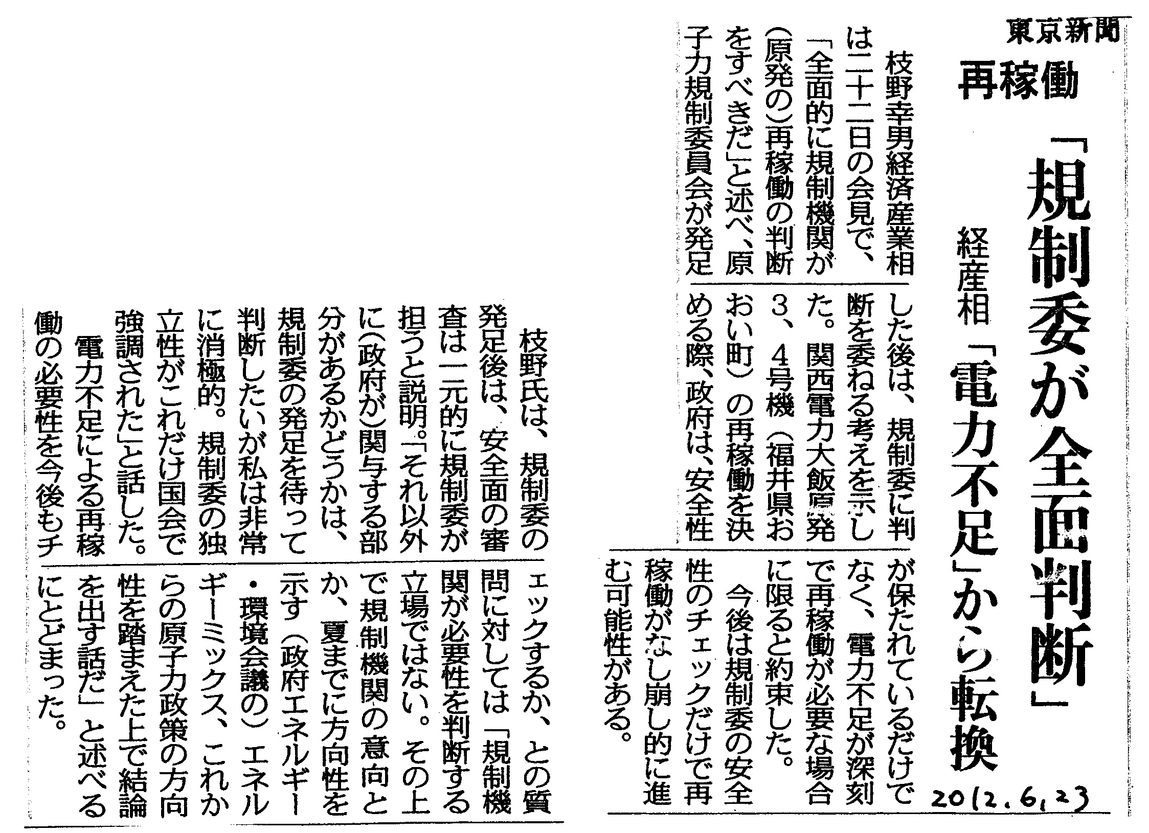 [2012_06_23_01]再稼働 「規制委が全面判断」 経産相 「電力不足」から転換(東京新聞2012年6月23日)
