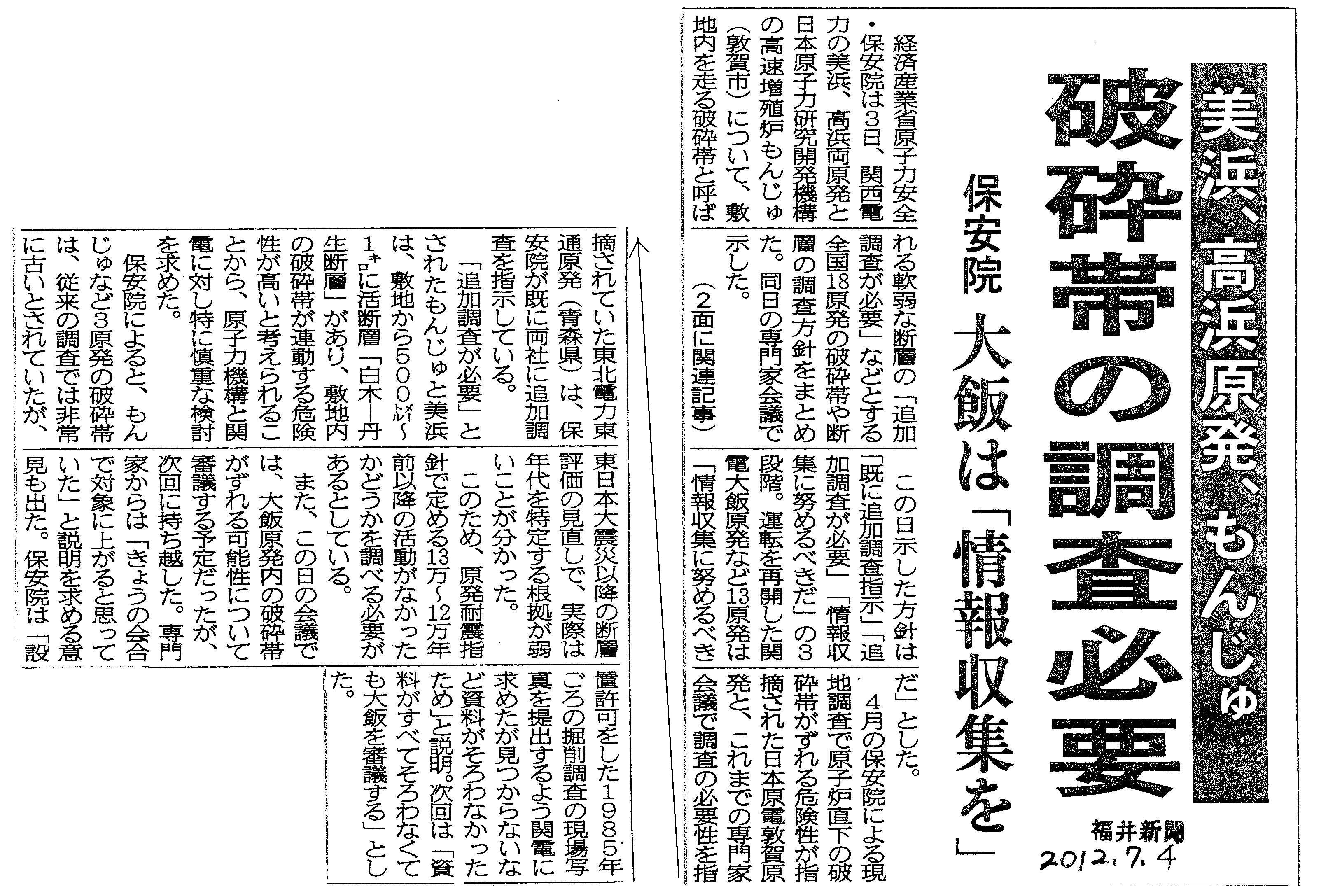 [2012_07_04_01]美浜、高浜原発、もんじゅ 破砕帯の調査必要 大飯は「情報収集を」 (福井新聞2012年7月4日)