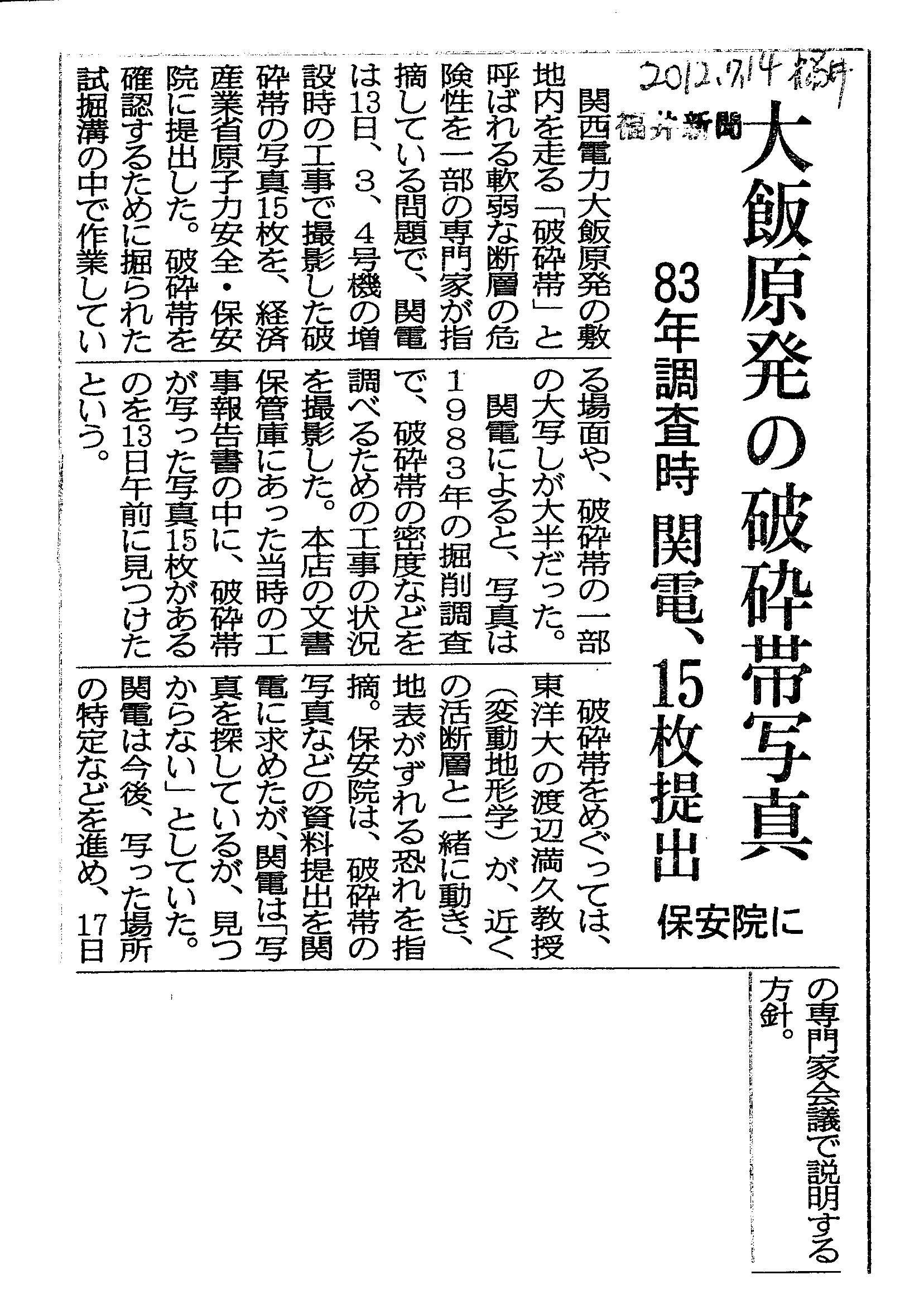 [2012_07_14_01]大飯原発の破砕帯写真 83年調査時 関電、15枚提出 保安院に (福井新聞2012年7月14日)