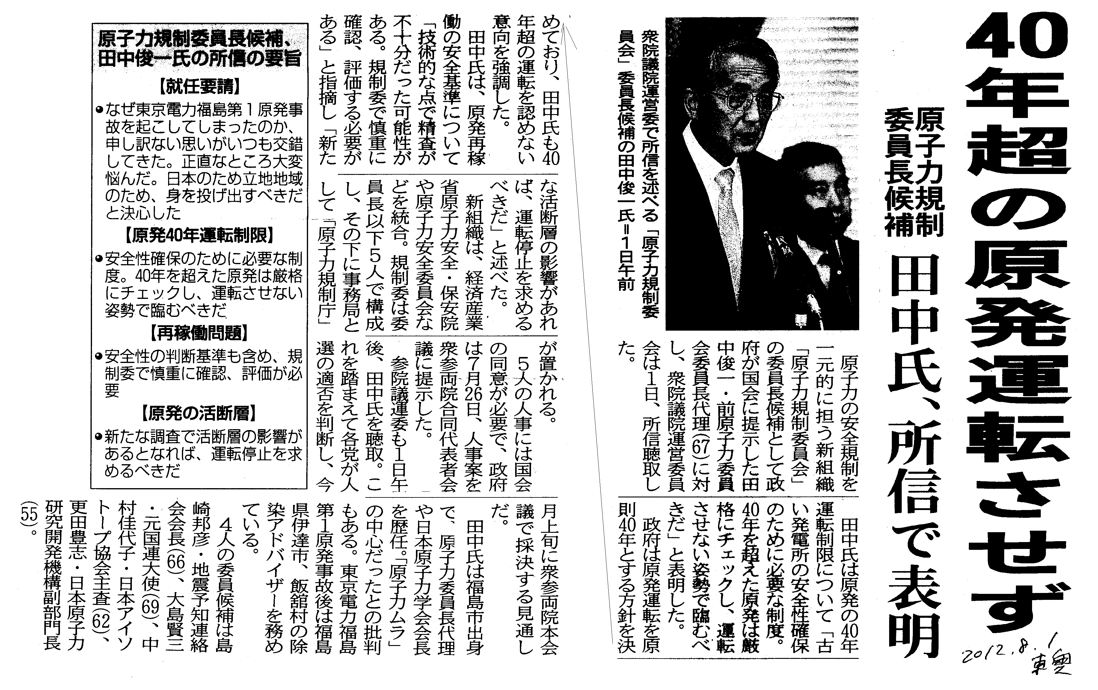 [2012_08_01_01]規制委委員長候補田中氏所信で40年超の原発運転させず (東奥日報2012年8月1日)